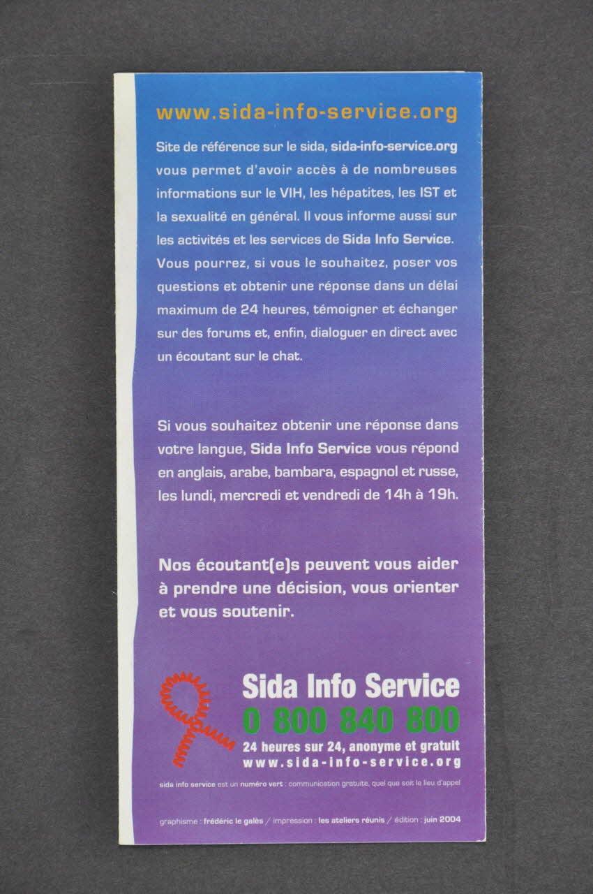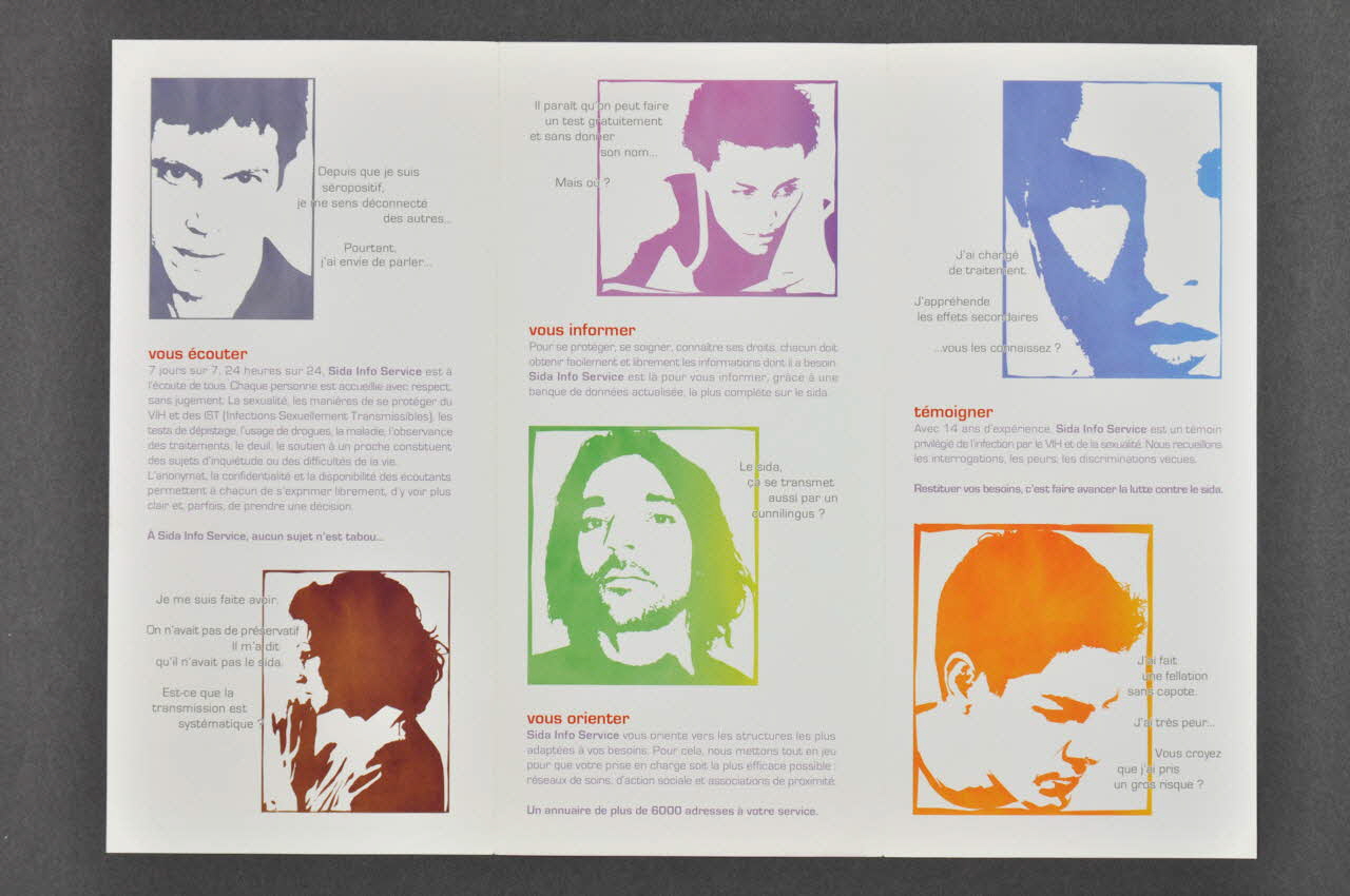 La couverture présente un dessin de visage féminin en bleu-violet sur fond blanc, sur lequel sont inscrits des fragments de questions (reprises à l'intérieur). Le titre du document se trouve en violet en partie inférieure, juste au-dessus du logo de Sida Info Service. Le dos, sur fond bleu-violet, se compose de l'adresse du site internet en partie supérieure, d'un texte de présentation du site, écrit en caractères blancs, au centre, suivi du logo de l'association. Les volets intérieurs, y compris le rabat intérieur présentent, sur fond blanc, des dessins de visages d'appelants en couleurs diverses sur chacun desquels une question est posée. En dessous de chaque dessin, un commentaire présente l'association.Inscriptions