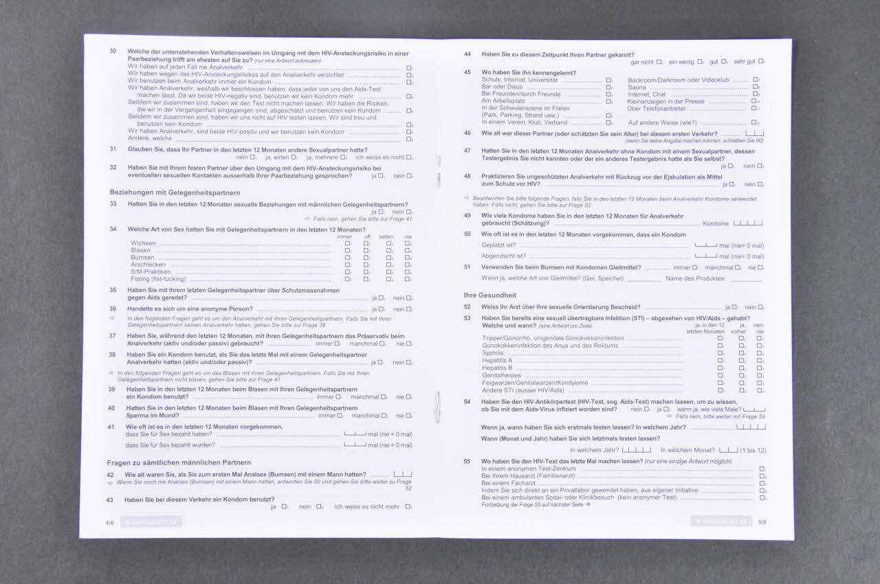 Nationale Umfrage zu den Verhaltensweisen und Einstellungen gegenüber HIV/AIDS bei Männern, die Sex Männern haben (inscription en capitales noires en haut de la page 1)Gaysurvey 04 (inscription blanche dans un encadré gris dans le coin inférieur extérieur de chaque page)Décor