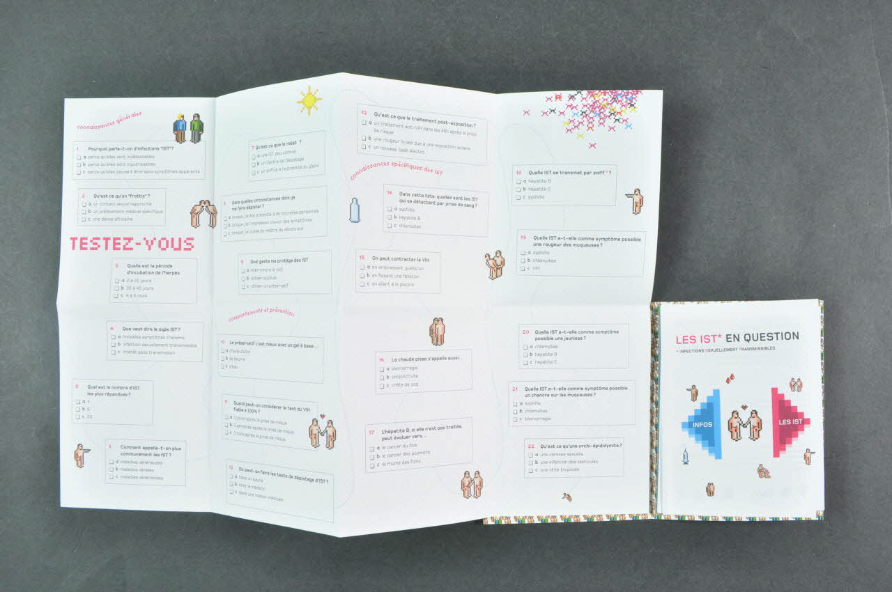 La seconde feuille, sur le volet droit, est un dépliant à huit volets. Au recto du premier, le titre est marqué en noir et rose puis suivi d'une illustration graphique montrant deux hommes qui se tiennent la main, sur les côtés on voit un motif traingulaire bleu et rose. Chaque volet traite d'une infection sexuellement transmissible; sur l'autre côté de la feuille on voit les réponses du test du premier dépliant.