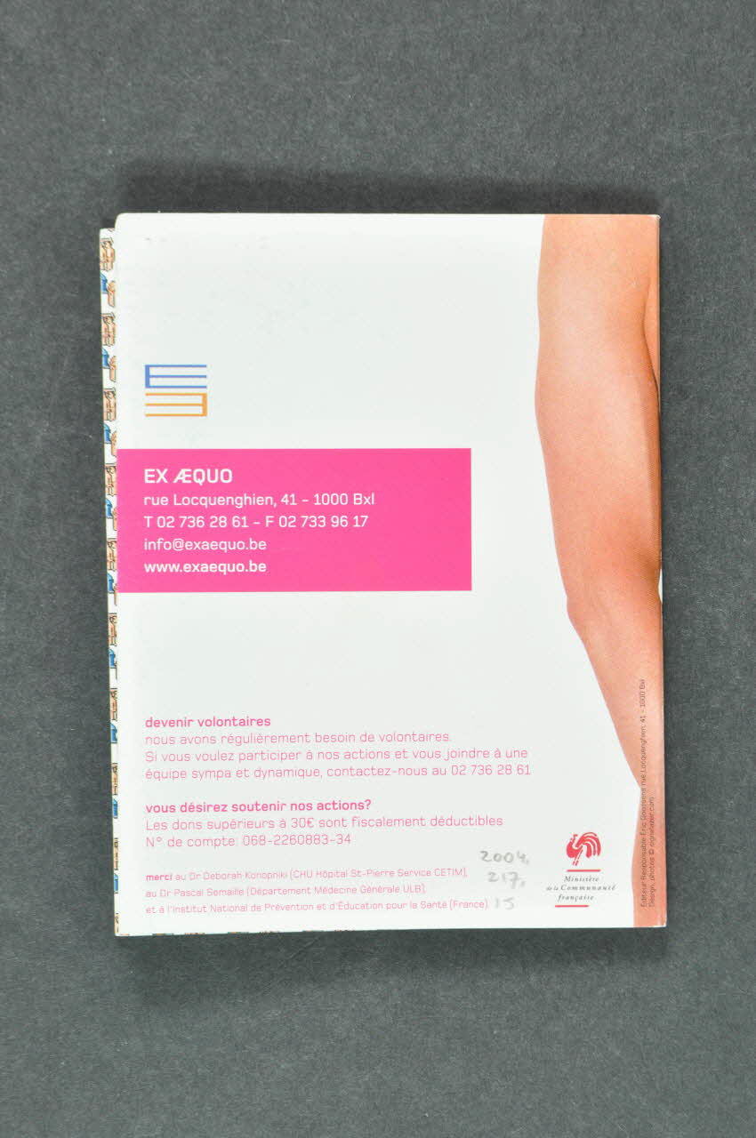 La quatrième de couverture comporte une partie de la photographie vue en première de couverture, sur celle-ci apparaît le bras de l'homme; les coordonnées d'une association sont marquées dans une languette rose, en dessous on trouve deux petits textes roses; dans l'angle droit se trouve le logo d'un ministère.