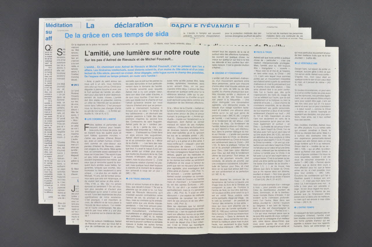 ouverture // Jean de Sevigny // // repères // Jean-Louis Vildé // La déclaration obligatoire // // traverses // Antoine Lion // De la grâce en ces temps de sida // // Dominique Goblet // L'amitié, une lumière sur notre route // // mosaïque // Jean-Marc Borello // La lutte contre le sida comme enjeu social (En première page)Date