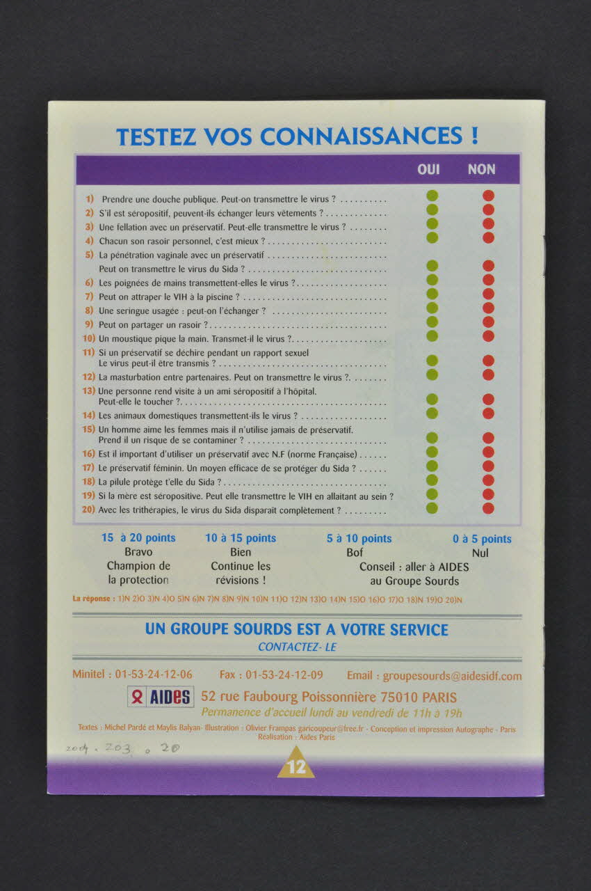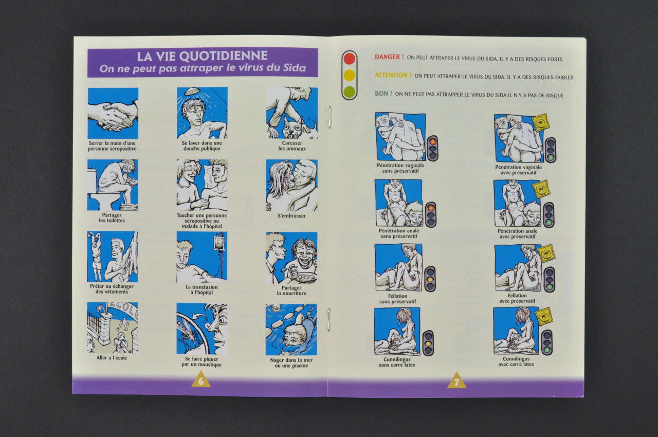 - p.2-3 : "La puberté chez les garçons" : "Pourquoi je bande ?" /" Le prépuce" / "La circoncision" / "C'est quoi du sperme ?" // - p.4-5 : "La puberté chez les filles" : "La taille du sein" / "Pourquoi des règles ? " / "Le cycle menstruel" // - p.6 : "La vie quotidienne. On ne peut pas attraper le virus du sida" : 4 rangées de 3 colonnes représentant les situations : "serrer la main d'une personne séropositive / se laver dans une douche publique / caresser les animaux / partager les toilettes / toucher une personne séropositive ou malade à l'hôpital / s'embrasser / prêter ou échanger des vêtements / la transfusion à l'hôpital / partager la nourriture / aller à l'école / se faire piquer par un moustique / nager dans la mer ou une piscine" // - p.7 : 2 colonnes de 4 dessins représentant des situations de danger (risque fort) : pénétration vaginale sans préservatif, pénétration anale sans préservatif / de risque faible: fellation sans préservatif, cunnilingus sans carré latex / sans risque : pénétration vaginale avec préservatif, pénétration anale avec préservatif, fellation avec préservatif, cunnilingus avec carré latex // - p. 8 : 2 colonnes de 3 dessins représentant des situations de danger (risque fort) : partager une seringue usagée / de risque faible : partager une brosse à dents, partager un rasoir / sans risque : chacun sa seringue personnelle, chacun sa brosse à dents personnelle, chacun son rasoir personnel. // - bas de la page 8 : "Pendant la grossesse si la mère est séropositive" (en noir avec dessins correspondant) : Sans médicaments, 20 % des bébés sont séropositifs / Avec médicaments, 2 % des bébés sont séropositifs / (Risque fort) Si la mère est séropositive avec allaitement / (Sans risque) Si la mère est séropositive avec biberons. // - p.9 : "Prévention" : Comment utiliser un préservatif ? 8 petits schémas légendés / Comment utiliser un carré de latex ? 8 petits schémas légendés / Comment utiliser un préservatif féminin ? 8 petits schémas légendés / Contraception // - p.10 : Dépistage "où et quand ?" // - p.11: Qu'est ce que le traitement d'urgence ? (au fil des pages)Décor