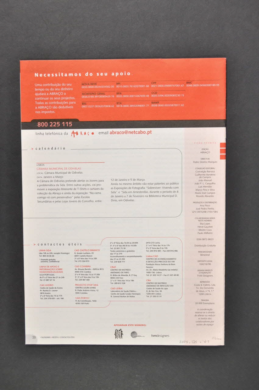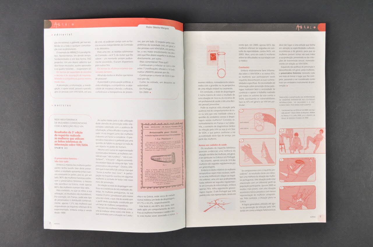 Sommaire en partie commenté : - p. 1 A droite : l'éditorial : "2003 fut une fois de plus une année perdue pour le contrôle de l'infection par le VIH au Portugal p. 2-8 Nouvelles - p.2 Réseau méditerranéen des femmes confrontées à l'infection par le VIH. Article avec schémas d'utilisation sur le préservatif féminin. -p.4 Discrimination et ignorance des institutions religieuses de soutien social. Portugal. 2003 - p.4 Abraço hors les murs à Caniçal (Madère) - p.4 Nouveau dépliant de Abbott sur la charge virale indétectable (photo) - p.5 Résumé du programme d'activités de l'association pour 2004 - p.6 Prévisions budgétaires pour 2004 - p.7 Recrutement pour un essai clinique de phase II au Portugal (TMC-114) - p.7 Critique par l'association du programme national sur le VIH/Sida (ADIS-SIDA) p.9-12 Traitements et tests - p.9 La directive 2001/20/CE de bonnes pratiques cliniques dans la conduite des essais cliniques et son application - p.11 Approbation de l'Emtriva par l'EMA (organisme européen) - p.12 Approbation du FOS-amprenavir par la FDA p.13-14 Nutrition et qualité de vie - p. 13 Le pancréas - p.14 Testostérone - hormone sexuelle masculine p.15-20 Témoignages - Volontaires - p. 15 Caro Dr Jaime Nina (médecin) - p.17 Conversation avec Tomas, séropositif depuis 13 ans : comment vivre avec le VIH - p.18 Recette - p.19 Glossaire - p.19 Petite annonce - p.19 Coordonnées d'Abraço à Lisbonne, Oeiras, Setubal, Gaia, Madère - p.20 Calendrier et adresses utiles.
