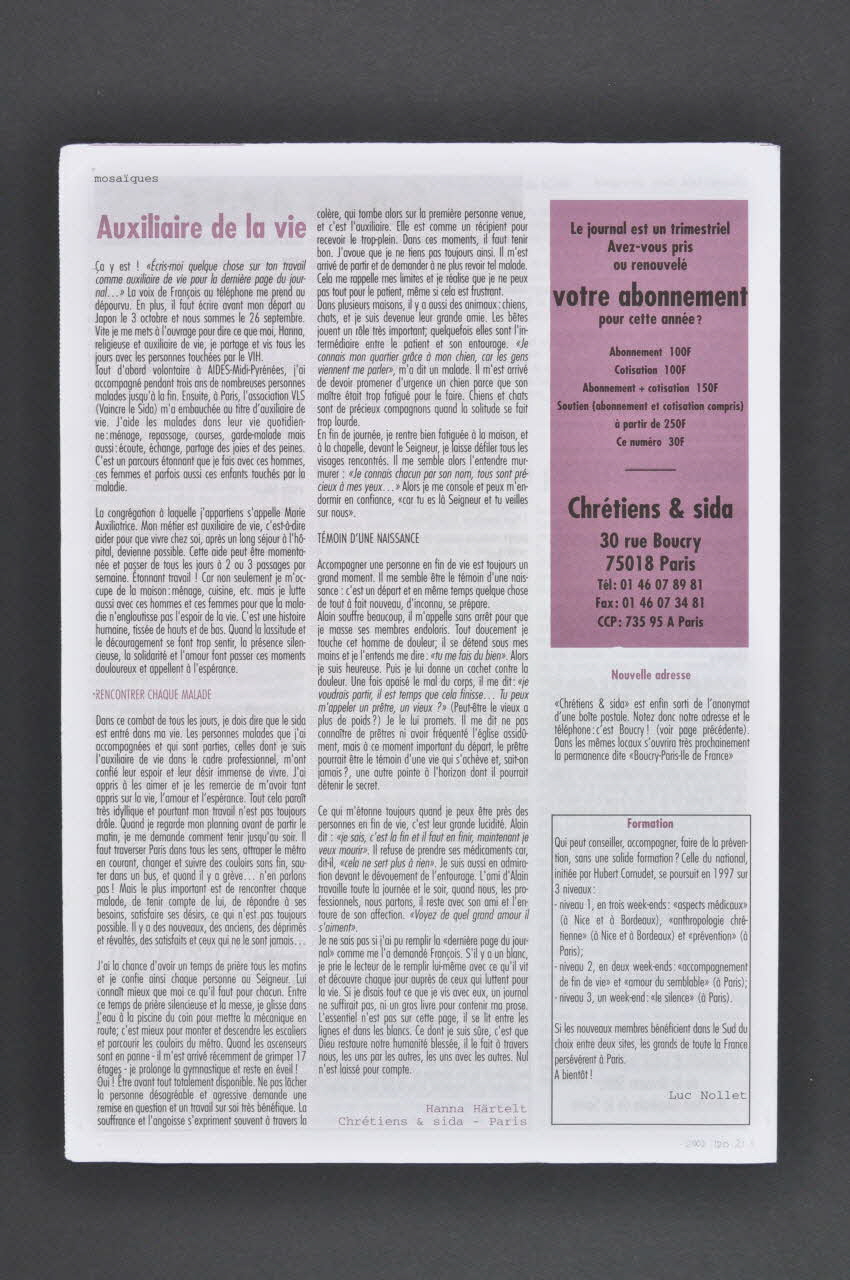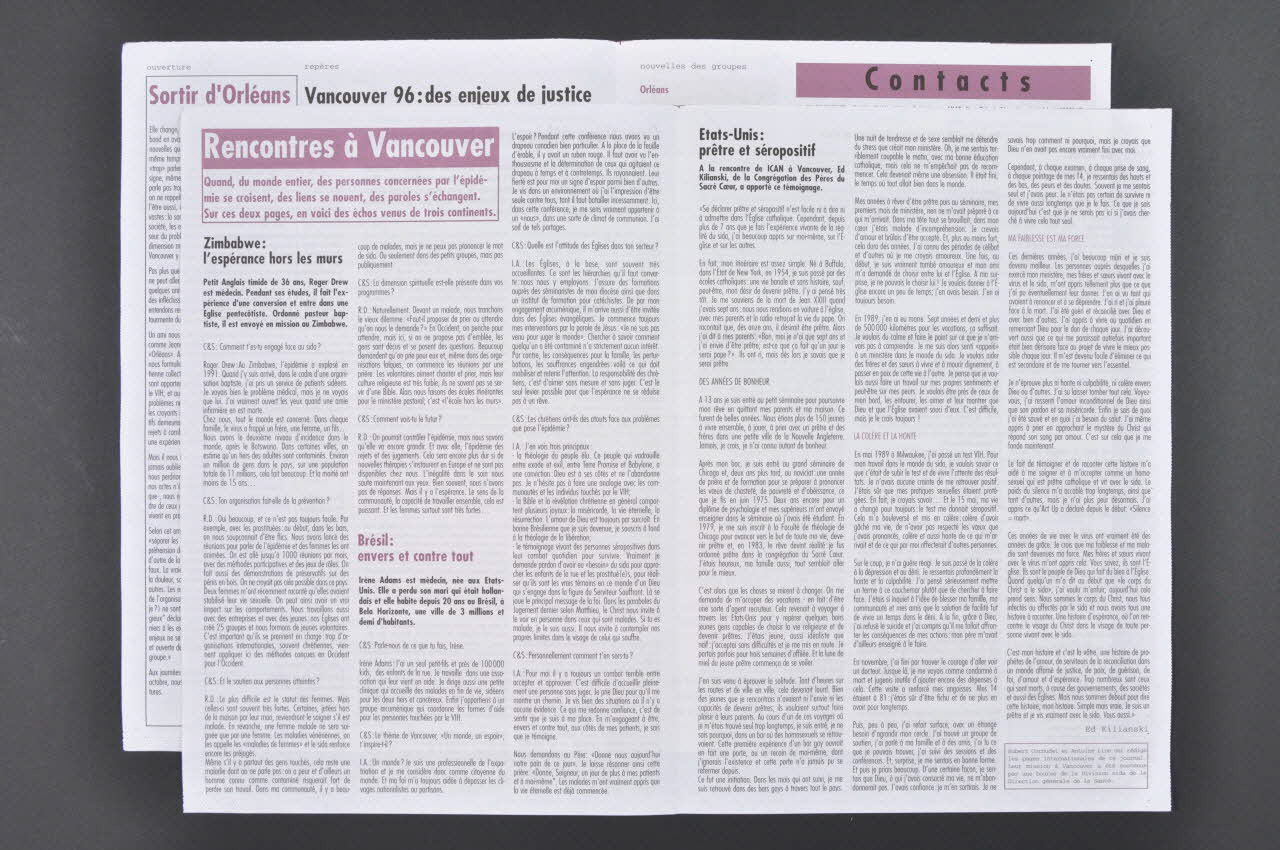 Chrétiens & sida // 30 rue Boucry // 75018 Paris (de la dernière page), à droiteOuverture : "Sortir d'Orléans" (échec du Sidaction) (p. 2)Vancouver 96 : des enjeux de justice (espoir, inégalités, place des chrétiens) (p. 2)Hubert Cornudet Questions éthiques internationales. (le secret, droits de l'homme, discrimination) (p. 3)textes de There's life after sex (AIDS Project Los Angeles) (p. 3): rencontres à Vancouver (Zimbabwe, Brésil) (p. 4)Ed Kilianski Etats Unis : prêtre et séropositif (p. 5)Le réseau ICAN : chrétiens du monde entier (p. 6)David Randall (1947‑1996) fondateur d'ICAN (p. 6)Florence Fourt (Association Solidarité Sida Saint‑Eustache ): Saint Eustache : une paroisse engagée (p. 6)Hanna Härtelt Auxiliaire de la vie (témoignage d'une religieuse auxiliaire de vie à VLS) (p. 8)Décor