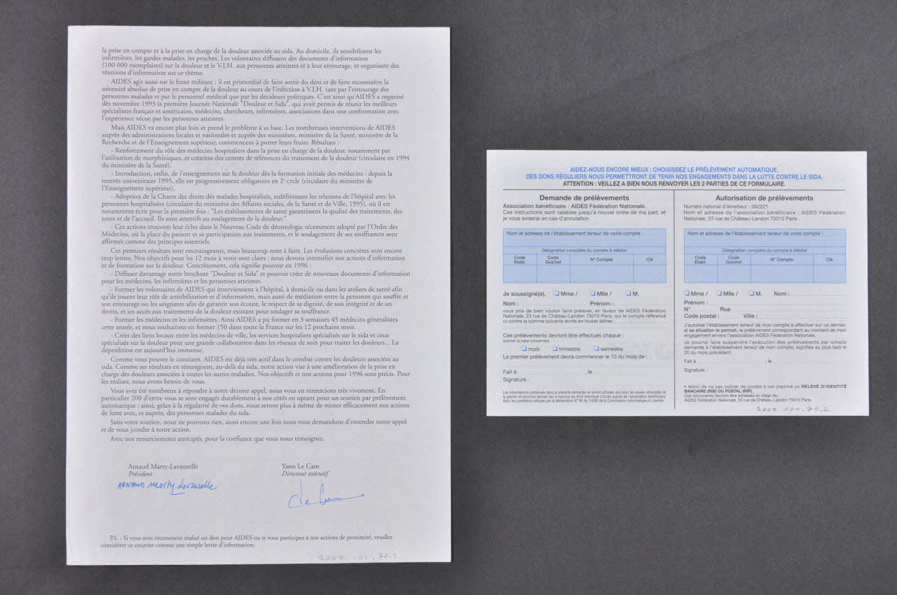Nous tenons à vous remercier une fois encore pour la constance de votre engagement à nos côtés dans la lutte contre le sida [...] Aujourd'hui, nous souhaitons attirer votre attention sur les douleurs associées à l'infection à V.I.H. // Contrairement au cancer, le sida n'est pas perçu par le public, les soignants, les proches voire par les personnes malades comme une maladie douloureuse. Elle l'est pourtant pour 50% des personnes atteintes : la douleur est psychologique ou physique, liée à l'annonce de la séropositivité, au début du traitement, à l'évolution de l'infection ou aux effets secondaires des médicaments. Lorsque la douleur est abordée au cours de l'infection à V.I.H, elle est, comme la dépression, trop souvent perçue comme un élément "normal" de l'infection et reste l'objet d'une certaine indifférence. Cette situation est à l'heure actuelle tout à fait inacceptable dans la mesure où tout un chacun admet aujourd'hui que subir la douleur n'est absolument pas une fatalité. Elle doit et peut être traitée au même titre que les autres symptômes liés au sida. // Dans un premier temps, la douleur doit être reconnue : aborder la douleur au cours de l'infection à V.I.H. nécessite avant tout de permettre à celui qui la ressent de l'exprimer. Au-delà de l'inquiétude, des éléments vont permettre de décrire la douleur. Avoir mal est un mélange de sensations, d'émotions, d'interprétations et de comportements. Cependant la douleur reste avant tout un phénomène individuel dont la mesure directe et objective n'est pas possible. Sa description et sa mesure reposent uniquement sur les mots que l'on utilise pour la décrire. Seule une bonne description de la douleur, et de la manière dont cette douleur modifie les attitudes et les comportements, pourra donner les informations nécessaires pour en trouver les causes. // Dans un second temps, la douleur doit être prise en charge par des traitements appropriés. En effet, les médicaments contre la douleur sont nombreux, plus ou moins puissants, et adaptés à chaque situation. Le traitement pourra aussi être associé à un soutien psychologique. // Il faut traiter, bien sûr, en premier lieu la cause de la douleur. Mais le traitement de la cause doit être accompagné d'un traitement spécifiquement destiné à atténuer la douleur. On dispose d'une gamme étendue de médicaments anti-douleur appelés antalgiques : les antalgiques faibles, les antagiques moyennement forts, et enfin es antalgiques forts comme les morphiniques. Malheureusement, en France, les médecins sont trop souvent réfractaires à l'usage de la morphine en raison du risque théorique de dépendance. Or, la possibilité de devenir dépendant de la morphine existe mais est largement surestimée. L'utilisation de la morphine ne devrait d'ailleurs pas être réservée aux éventuelles douleurs en fin de vie. Tout patient présentant des douleurs résistant aux autres antalgiques ou très intenses doit pouvoir bénéficier de la morphine, quel que soit le stade d'évolution de la maladie. // AIDES se bat déjà avec beaucoup de détermination sur tous les fronts de la douleur associée au sida et souhaite renforcer son action dans ce domaine. // AIDES agit en proximité des personnes atteintes : grâce à ses 3600 volontaires qui se battent chaque jour sur le terrain. Ainsi, à l'hôpital, les volontaires sensibilisent les différents intervenants auprès des personnes malades à la prise en compte et à la prise en charge de la douleur associée au sida. Au domicile, ils sensibilisent les infirmières, les gardes malades, les proches. Les volontaires diffusent des documents d'information (1000 000 exemplaires) sur la douleur et le V.I.H. aux personnes atteintes et à leur entourage, et organisent des réunions d'information sur ce thème. // AIDES agit aussi sur le front militant : il est primordial de faire sortir du déni et de faire reconnaître la nécessité absolue de prise ne compte de la douleur au cours de l'infection à V.I.H. tant par l'entourage des personnes malades et par le personnel médival que par les décideurs politiques. C'est ainsi qu'AIDES a organisé dès novembre 1993 la première Journée Nationale "Douleur et Sida", qui avait permis de réunir les meilleurs spécialistes français et américains, médecins, chercheurs, infirmières, associations, dans une confrontation avec l'expérience vécue par les personnes atteintes. // Mais AIDES va encore plus loin et prend le problème à sa base. Les nombreuses interventions de AIDES auprès des administrations locales et nationales et auprès des ministères, ministère de la Santé, ministère de la Recherche et de l'Enseignement supérieur, commencent à porter leurs fruits. Résultats : // Renforcement du rôle des médecins hospitaliers dans la prise en charge de la douleur, notamment par l'utilisation de morphiniques, et création des centres de référence du traitement de la douleur (circulaire en 1994 du mini (Extraits de la lettre.)