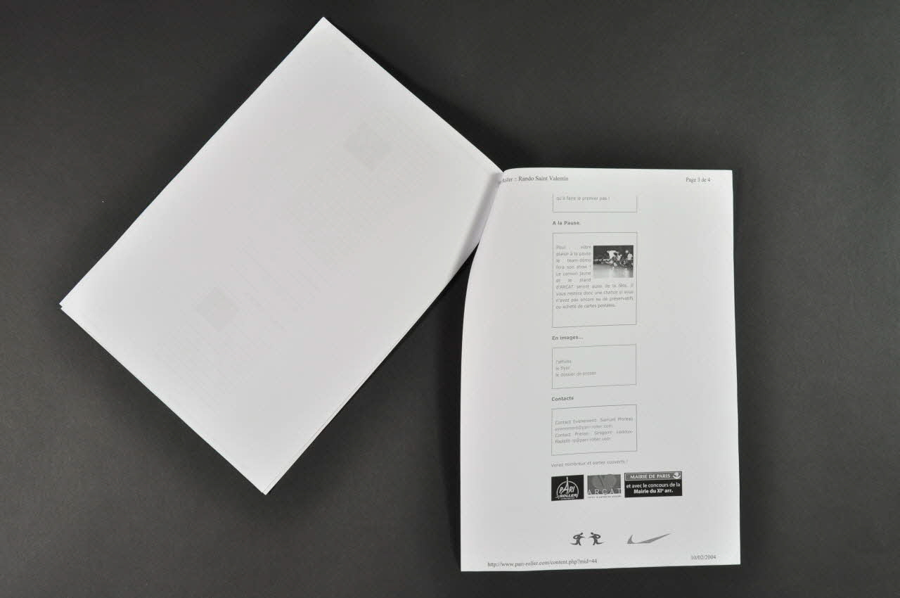 Présentation de la Rando Saint Valentin du 13 février 2004. // - "ARCAT et Pari Roller s'unissent le temps de la nuit de la Saint Valentin, pour organiser une grande campagne de prévention contre le VIH/sida lors de la randonnée du vendredi 13 février 2004. A l'heure où l'attention de tous se relâche, où les comportements à risques se multiplient et où, malgré les progrès, chaque jour des personnes meurent du VIH/sida, la fête des amoureux est ainsi l'occasion de rappeler que le seul moyen d'aimer en toute sécurité reste le préservatif." // - présentation d'ARCAT // - Au départ... Une partie des bénéfices de Paris Roller (vente de cartes postales et de bâtons lumineux) ira exceptionnellement à ARCAT.... ARCAT sera présente avec un stand d'information et de prévention... Grande distribution de plus de 5.000 préservatifs masculins et féminins. // - Pendant la randonnée. "Trouvez votre Valentin ou votre Valentine ! Vous n'avez pas encore trouvé quelqu'un avec qui passer la soirée du 14 février ? Ce n'est pas un problème ! Passez retirer au début de la randonnée un coeur autocollant, au camion jaune ou au stand d'ARCAT (rouge si vous cherchez une femme, bleu si vous cherchez un homme) et collez le de manière bien visible sur vos vêtements. Il ne vous reste plus qu'à faire le premier pas !" // - A la pause.. Le stand d'ARCAT sera aussi de la fête. Il vous restera donc une chance si vous n'avez pas encore eu de préservatifs. (Description du contenu), à l'intérieurDécor