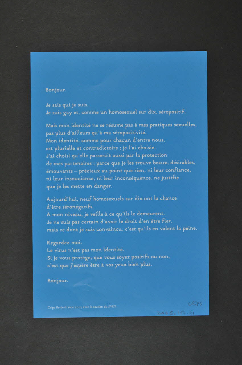 Bonjour / Je sais qui je suis. / Je suis gay et, comme un homosexuel sur dix, séropositif. / Mais mon identité ne se résume pas à mes pratiques sexuelles, / pas plus d'ailleurs que ma séropositivité. / Mon identité, comme pour chacun de nous, / est plurielle et contradictoire ; je l'ai choisie. / J'ai choisi qu'elle passerait aussi par la protection / de mes partenaires ; parce que je les trouve beaux, désirables, / émouvants - précieux au point que rien, ni leur confiance, / ni leur insouciance, ni leur inconséquence, ne justifie / que je les mette en danger. / Aujourd'hui, neuf homosexuels sur dix ont la chance / d'être séronégatifs. / A mon niveau, je veille à ce qu'ils le demeurent. / Je ne suis pas certain d'avoir le droit d'être fier, / mais ce dont je suis convaincu, c'est qu'ils en valent la peine. / Regardez-moi. / Le virus n'est pas mon identité. / Si je vous protège, que vous soyez positifs ou non, c'est que j'espère être à vos yeux bien plus. / Bonjour. // // Crips Ile-de-France 2005 avec le soutien du SNEG (En blanc sur fond bleu turquoise.), verso