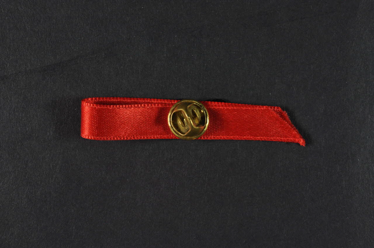 .1 : Petit ruban rouge en tissu satiné, replié pour former le symbole de la lutte contre le SIDA, tenu au centre par un pin's.