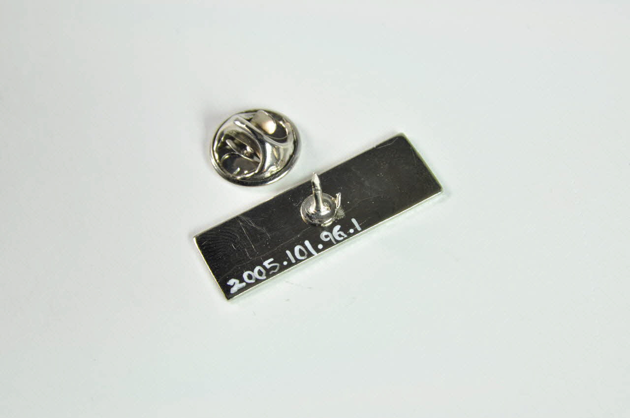 Métal moulé émaillé. / Petit pin's rectangulaire en métal gris, présentant sur un fond émaillé blanc le logo de AIDES en capitales bleues, précédé d'un ruban rouge.Décor