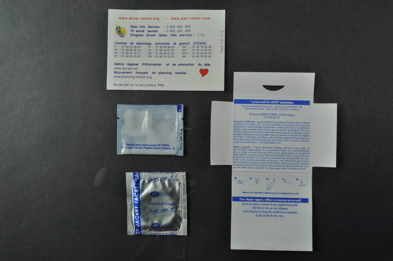 - un carton blanc rectangulaire. Au centre du recto, un rectangle bleu porte au centre un coeur rouge et une tour Eiffel stylisée noire et inscription en noir et en blanc. Des inscriptions rouges l'encadrent (un petit coeur rouge sépare chaque mot). Au dos, on trouve des adresses utiles : sites d'arcat et de pari roller, téléphones de Sida Info Service, Fil santé jeunes, Drogues alcool tabac info service, Centres de dépistage anonyme et gratuit, CRIPS, Mouvement français de planning familial. - une pochette de préservatif carrée en papier glacé, se fermant par un onglet s'insérant dans une encoche. Sur l'avant, sur un fond vert est dessiné au centre un préservatif rond jaune entouré d'un halo blanc. Tout autour, en petites capitales brunes figure un slogan. En bas, on retrouve le logo de la Mairie de Paris. Au dos, en brun, on trouve l'indication "Préservatif masculin lubrifié avec une dose de gel lubrifiant", et en bleu, les coordonnées des trois CIDAG de la Mairie de Paris. A l'intérieur, en petits caractères bleus sont imprimés des conseils d'utilisation, un mode d'emploi avec cinq petits schémas légendés, et les conseils de contacter Sida Info Service en cas de rupture. - Dans enveloppe carrée en papier métallisé argenté, un préservatif Jacket. - Dans une petite enveloppe rectangulaire bleue sur le devant, du "Gel lubrifiant Jacket".Inscriptions