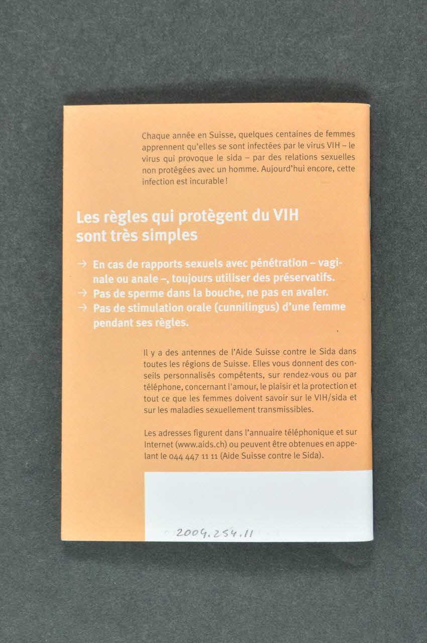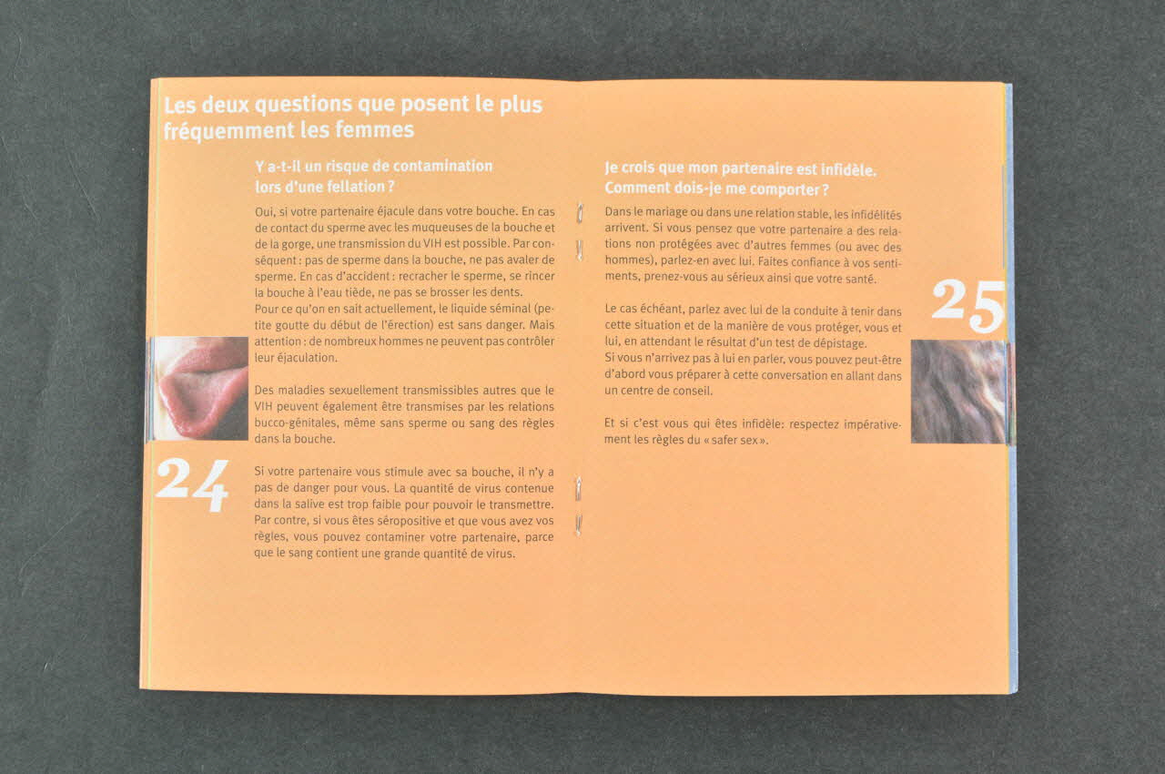 - Liaison, nouvelle relation, aventure spontanée..../ Chaque année en Suisse, environ 300 femmes apprennent qu'elles se sont contaminées avec le VIH. Huit sur dix se sont infectées en ayant des rapports sexuels non protégés avec un homme / L'homme avec lequel vous couchez a sa propre histoire. Il a déjà couché avec d'autres femmes -dans le cadre d'une relation stable, d'une aventure... Un nouvel amour, si grand soit-il, a généralement été précédé d'un autre / Ne vous gachez pas le plaisir - protégez-vous // - Pour mémoire, les recommandations pour des relations à moindre risque ("safer sex") / Veillez à ce qu'il utilise toujours un préservatif en cas de pénétration -vaginale ou anale / - Pas de sperme dans la bouche, ne pas en avaler. /- Pas de sexe oral (cunnilingus) avec une femme pendant ses règles" / les femmes d'aujourd'hui utilisent des préservatifs !" // - Vous commencez une nouvelle relation ? (dépistage, pas de confiance aveugle) // - Hésitations avec un nouveau partenaire : comment va-t-il réagir si je veux utiliser un préservatif ? / Déjà dans le feu de l'action, parler de préservatf va jeter un froid ? / Mais il ne veut pas de préservatif !( réponses aux divers arguments) / Justement, vous n'avez pas de préservatif sur vous et lui non plus ? / Peur de perdre l'homme de vos rêves en lui disant "non" pour le sexe sans protection ? // - Situations spéciales : / alcool, drogues et relations non protégées / Les voyages / Avec une femme // - Les préservatifs, même pour nous ? La première fois / ne pas s'abandonner à la confiance au partenaire masculin / femmes d'un certain âge // - Y a-t-il un risque de contamination lors d'une fellation ? // Erreurs les plus fréquentes en matière de "sexe à moindre risque sans préservatif" (il a l'air en bonne santé, je ne couche qu'avec des Suisses, je demande toujours s'il y a un risque, les relations vaginales sont moins dangereuses, il se retire avant l'éjaculation... / "Voulez-vous vraiment ne vous fier qu'à votre chance ? Non ? Alors, rappelez-vous : seul le préservatif protège vraiment" // Tout ce qu'il faut savoir sur les préservatifs, les lubrifiants et le Femidom : mode d'emploi du préservatif masculin en 4 schémas légendés, tailles, conservation, qualité, avantages du Femidom, les lubrifiants / "De nos jours, acheter des préservatifs est aussi banal qu'acheter un déodorant ou des chaussettes / Accident de préservatif (utilisation incorrecte) / mesures d'urgence // Informations de base sur les grossesses non désirées, le VIH/sida et d'autres maladies sexuellement transmissibles, le dépistage du sida (au fil des pages)Texte