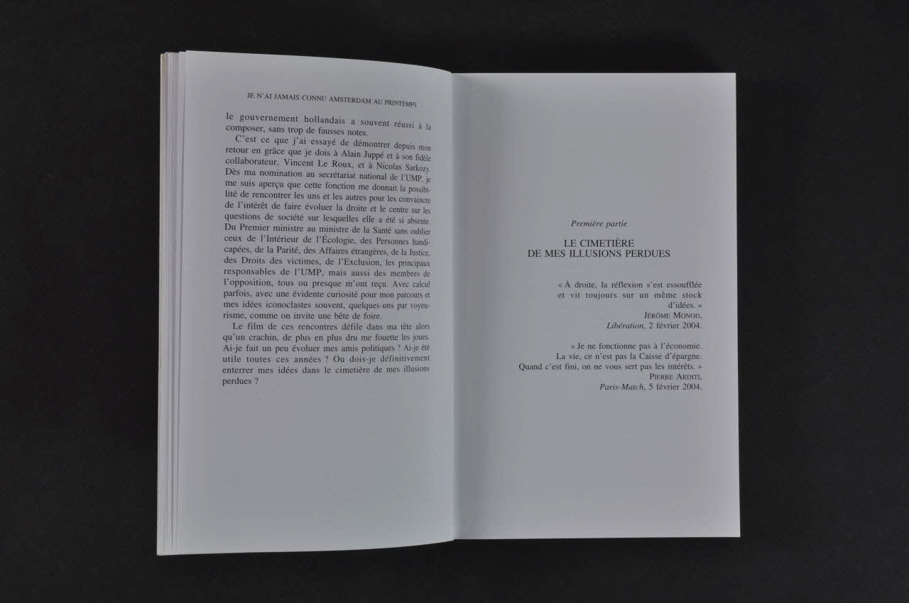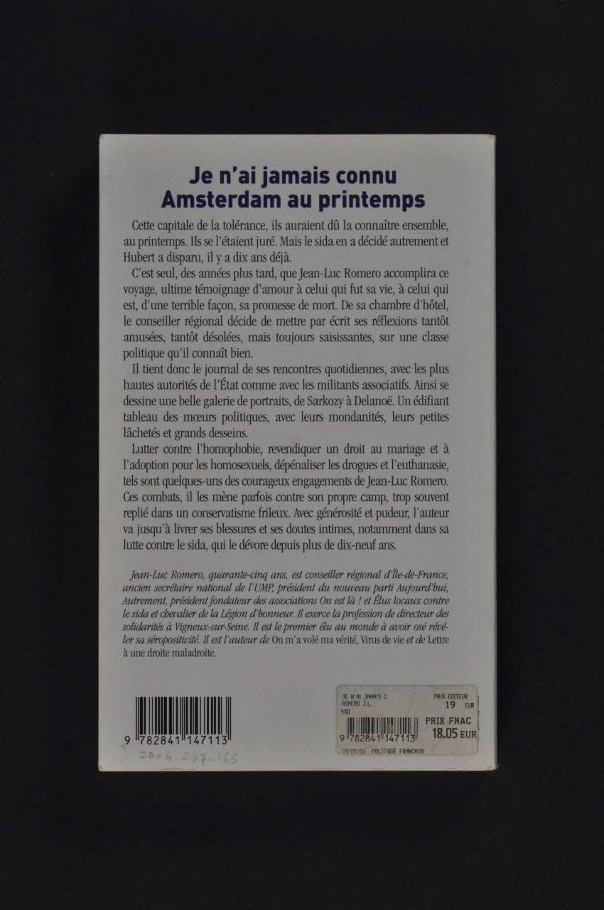 Reliure thermo-collée / Couverture en papier cartonné glacé et imprimé. Elle est plié et thermo-collée. / Etiquette autocollante imprimée en noir. / Livre de format rectangulaire, de Jean-Luc Romero, intitulé "Je n'ai jamais connu Amsterdam au printemps". Il est édité par Ramsay. La couverture est en papier cartonné, glacé sur le dessus. L'avant de la couverture a pour fond une photographie noir et blanc de l'auteur. En haut, en capitales blanches, on trouve le nom de l'auteur ; vers le bas, sur un bandeau gris transparent, en caractères bleus foncés, le titre du livre. En dessous, en petits caractères blancs : "récit" et tout en bas le nom de l'éditeur.