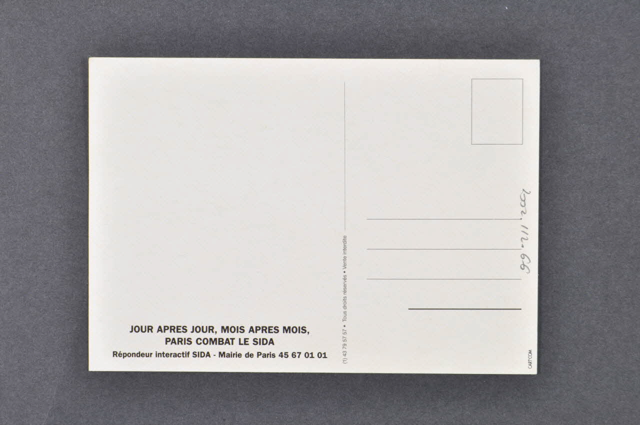 JOUR APRES JOUR, MOIS APRES MOIS, // PARIS COMBAT LE SIDA // Répondeur interactif SIDA - Mairie de Paris 45 67 01 01 (En bas à gauche), versoJ'aime // les // hommes (De façon manuscrite), rectoAuteur