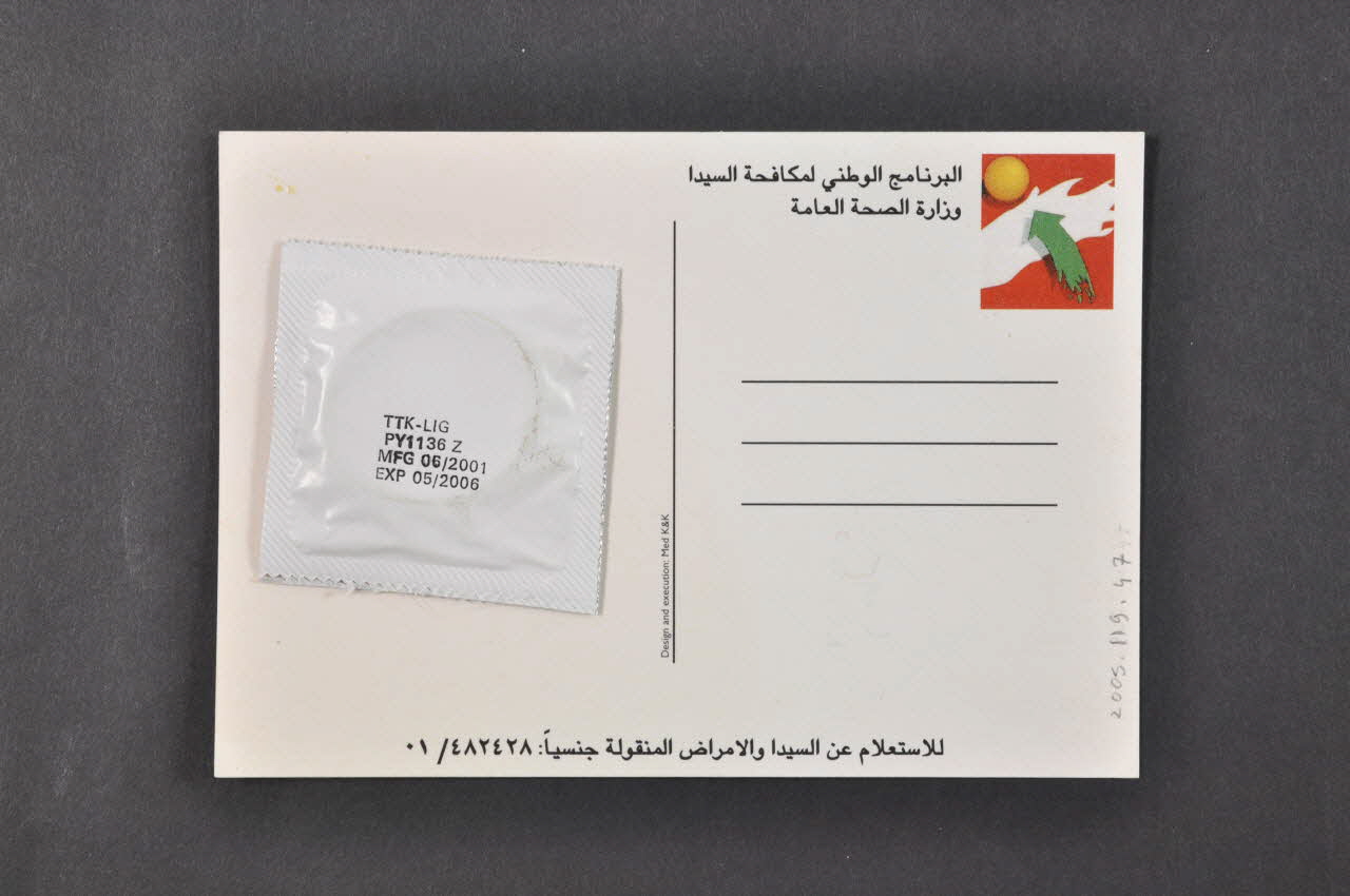 Sur la face est imprimée, en noir et blanc, la photographie d'un homme, le haut du torse nu, se cachant le visage avec les mains. Un préservatif orange rond est tenu dans une de ses mains ouvertes. En haut, en blanc, figure une inscription en arabe. En bas, au centre, petit drapeau arc en ciel et une inscription en blanc en arabe.