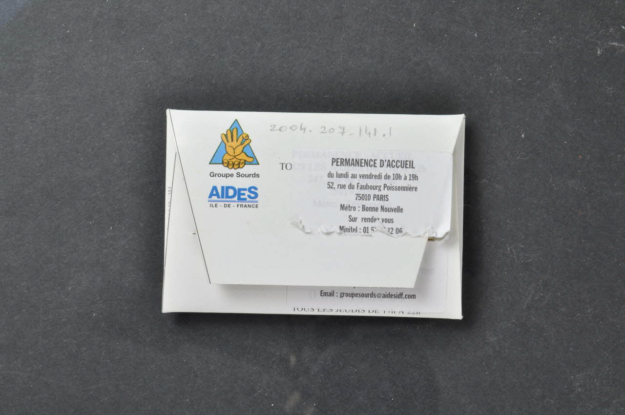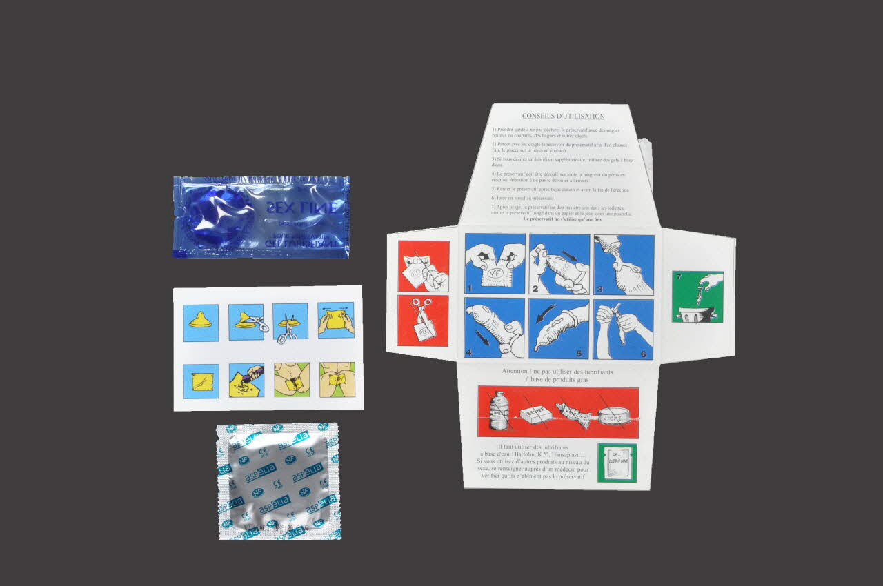 Devant se trouve la photo noir et blanc de deux têtes de garçons. L'un apprend à l'autre à mettre un préservatif en l'enfilant sur son doigt. Au dos, collé sur le logo du Groupe Sourds de Aides, les coordonnées de Info Sida Sourds (minitel et mail). A l'intérieur, sept schémas d'utilisation très clairs, légendés. A l'intérieur se trouve : - Une feuille détachée présentant huit schémas montrant comment faire une digue dentaire à partir d'un préservatif. - Dans une enveloppe carrée métallisée argenté, un préservatif Aspelia. - Dans une enveloppe rectangulaire bleu transparent, du lubrifiant Sex Line.Inscriptions