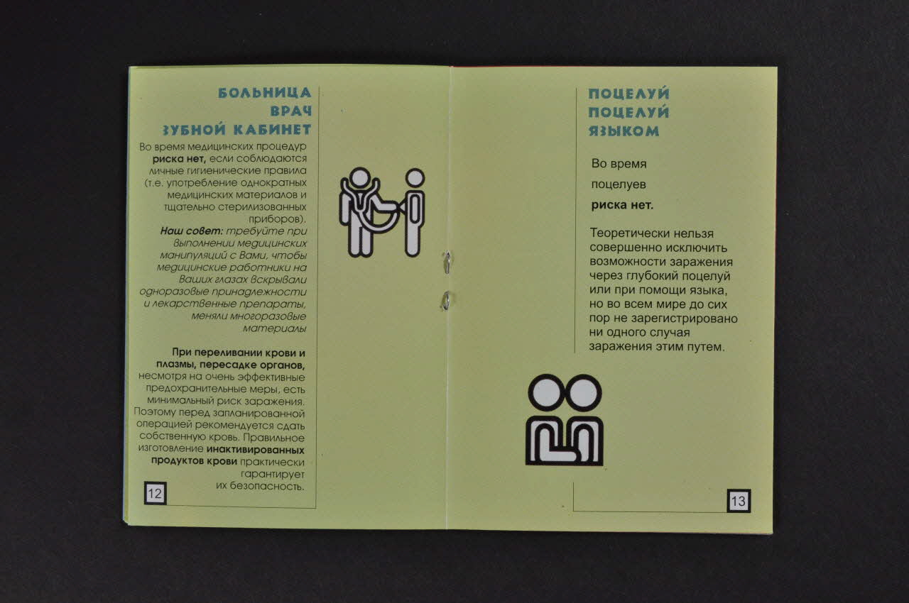 - fond vert, ce qui ne transmet pas : un "non mode" par page avec petit schéma et explications(postillons, serrement de main, moustiques, bains, repas, même verre, vie quotidienne, coiffeur, consultation médicale, baisers