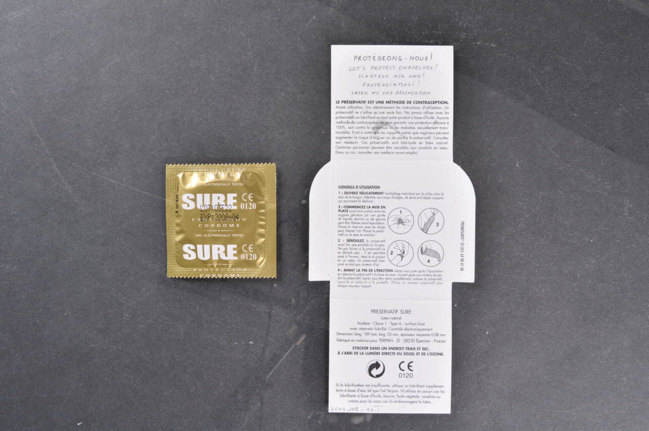 On y trouve également des conseils d'utilisation en quatre petits schémas légendés et des renseignements sur le préservatif SURE fabriqué par Terpan.
