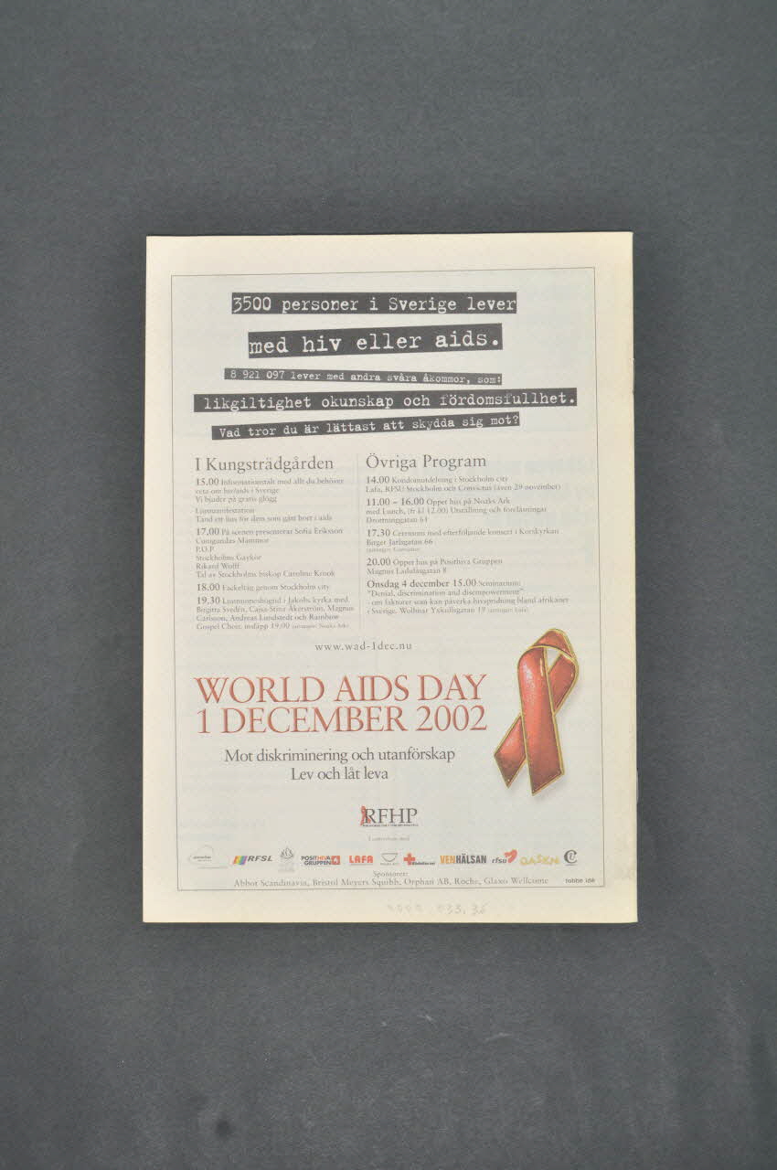 3500 personer i Sverige lever // med hiv eller aids. // [...] // I Kungsträdgården // [...] // Övriga Program // [...] // www.wad-1dec.nu // // WORLD AIDS DAY // 1 DECEMBER 2002 // // Mot diskriminering och utanförskap // Lev och låt leva (en quatrième de couverture)Adresse, titre, nom d'association, concernant la date, auteur