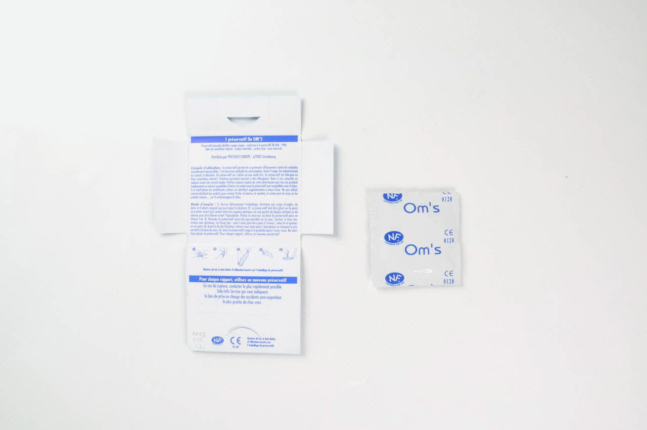 L'avant présente sur toute la surface, une inscription en noir. Au dos, on trouve la liste et les coordonnées des Centres d'Information et de Dépistage Anonyme et Gratuit et des Dispensaires antivénériens du département à Marseille (3), Aix-en Provence, Arles, Aubagne, Marignane, Martigues, Salon-de-Provence, Vitrolles. A l'intérieur sont imprimés des conseils d'utilisation et mode d'emploi avec cinq petits schémas légendés. A l'intérieur est contenu un préservatif rangé dans une enveloppe carrée blanche, en plastique, couverte d'inscriptions précisant la marque, "Om's" en bleu.Inscriptions