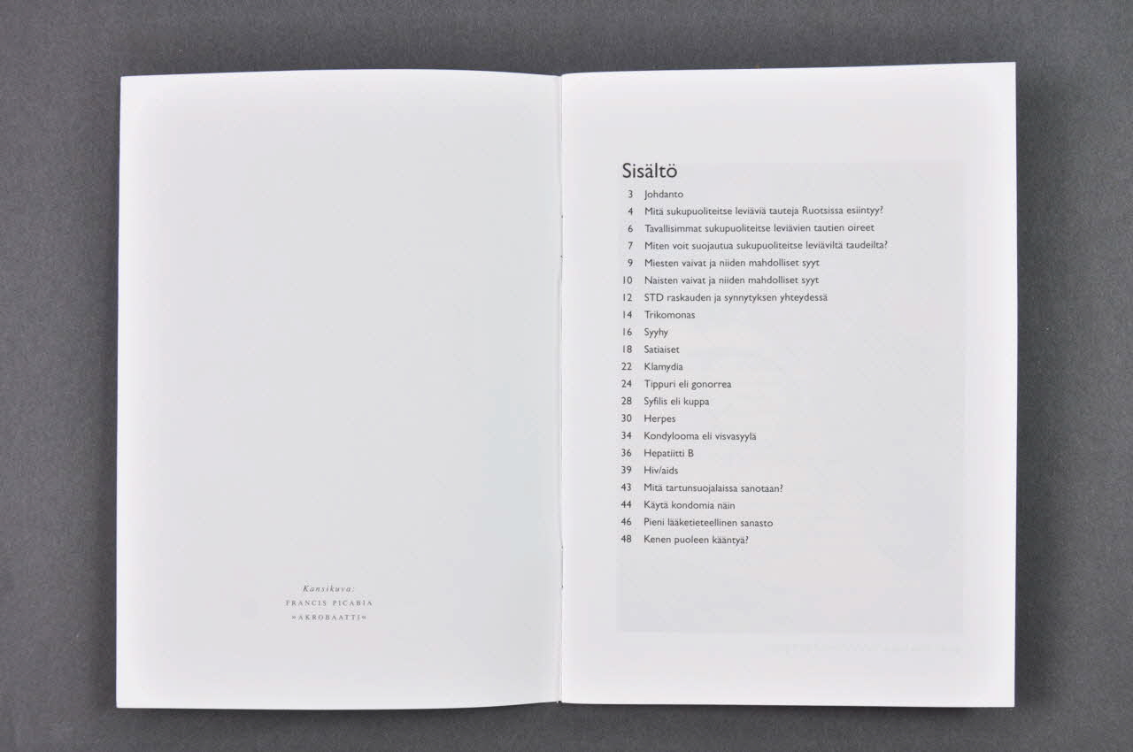 "Ajattelemisen aihetta / Kirjanen sukupuoliteitse laviävistä taudeista" (Prévention. Brochure sur les maladies sexuellement transmissibles) (sur la couverture)Texte, adresse