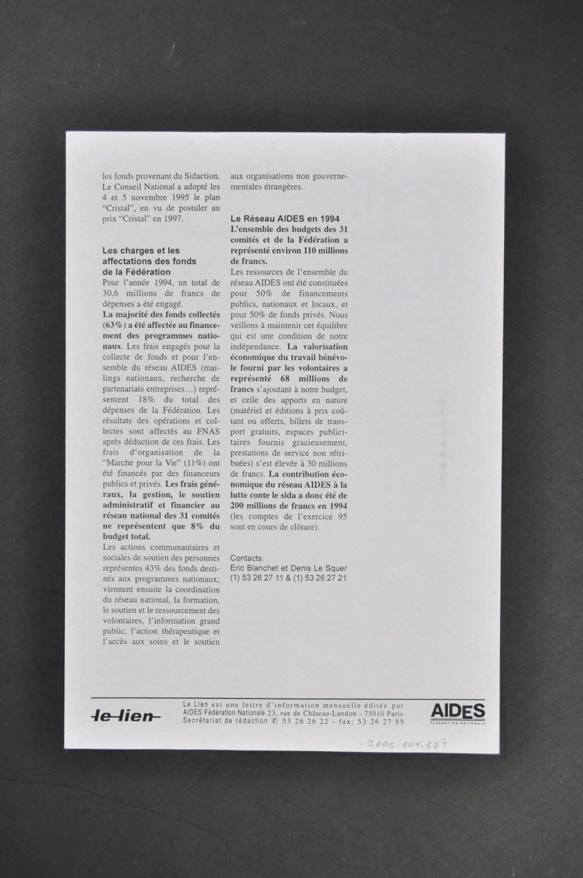 FINANCEMENTS ET TRANSPARENCE (en haut), recto- Les problèmes de l'ARC // - Le rôle de la Cour des Comptes // - Transparence // - Les charges et les affectations des fonds de la Fédération // - Le réseau AIDES en 1994 (titres des sections de texte)Concernant le lieu d'édition, nom d'association