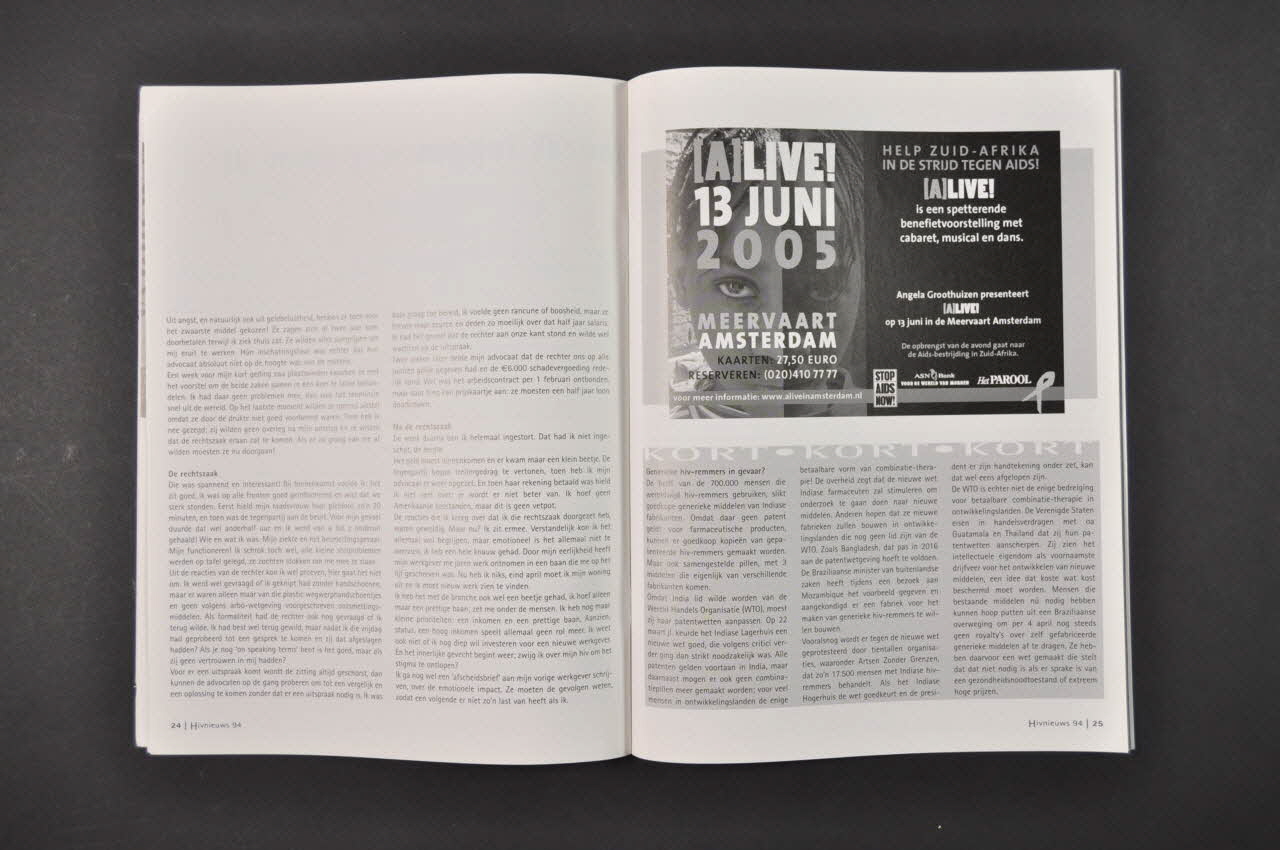 Revue de l'association HIV VERENIGING tirée à 2500 exemplaires. Traduire les titres. - p.4-5 Levensverzekeringen eindelijkk mogelijk. Maar niet voor iedereen. Cf illustration de la couverture et annonce en couverture. - p.6-10 Een spuitomruilkraampje op een vuilnisbelt in Delhi. Nederlandse hiv-preventie voor drugsgebruikers in Oost-Europa en Azië (Usage de drogues en Europe de l'Est et en Asie) (annonce en couverture) - p.11 Lettre de lecteur : Aids Memorial Day - p.12-14 Liever Normaal. Hiv, seks en stigma gaan hand in hand (photo d'affiche dans la rue : "I have HIV. Do you have a problem with that ?" - p.15, 21, 25, 30 Brèves ( dans le monde) - p.16-19 Homo hiv-preventie in focus. Angst en onmacht in de hiv-preventie - p.20-21 Ontslag wegens verzwijgen hiv-status onterecht - p.22-24 Ik vond gewoon dat ikk het moest zeggen (témoignage) - p.26-27 Juridische Kronick 7. Nederlandse vrijspraakk en Engelse veroordelingen - p.28-29 Hetero's borrelen in Café Plus - p.30 BD Condromen - p.31-33 Therapiepauzes - p.34-37 Nieuwe soorten hiv-remmers (annonce en couverture) - p.38-39 Brèves sur les traitements - p.40 Nouvelles de l'association. - p.41-43 Activités de l'association et d'autres associations, agenda.