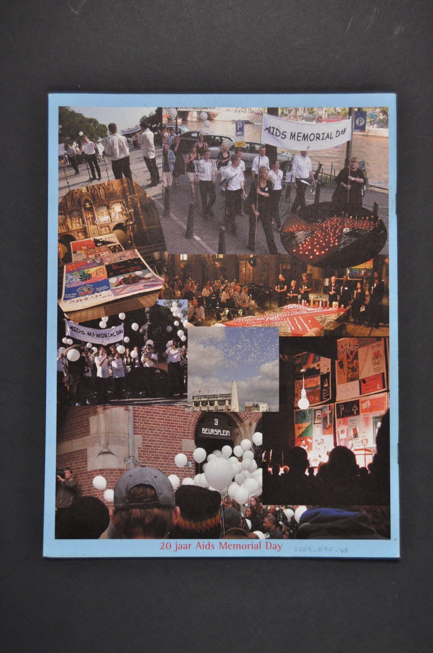 20 jaar Aids Memorial Day (Titre rouge en dessous des photographies au dos de la revue), en basHivnieuws (Titre de la revue inscrit en noir dans le haut de la page), sur la couvertureSous-titre