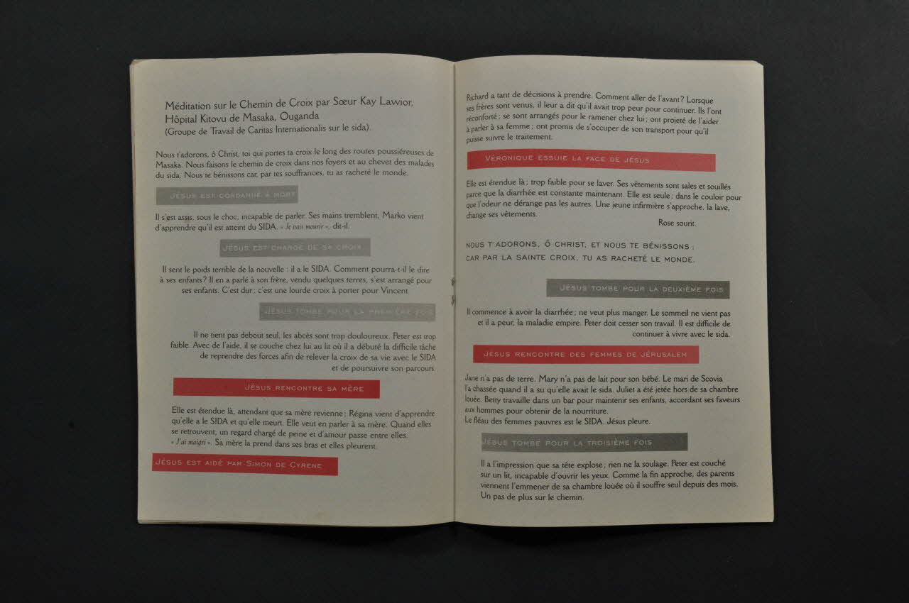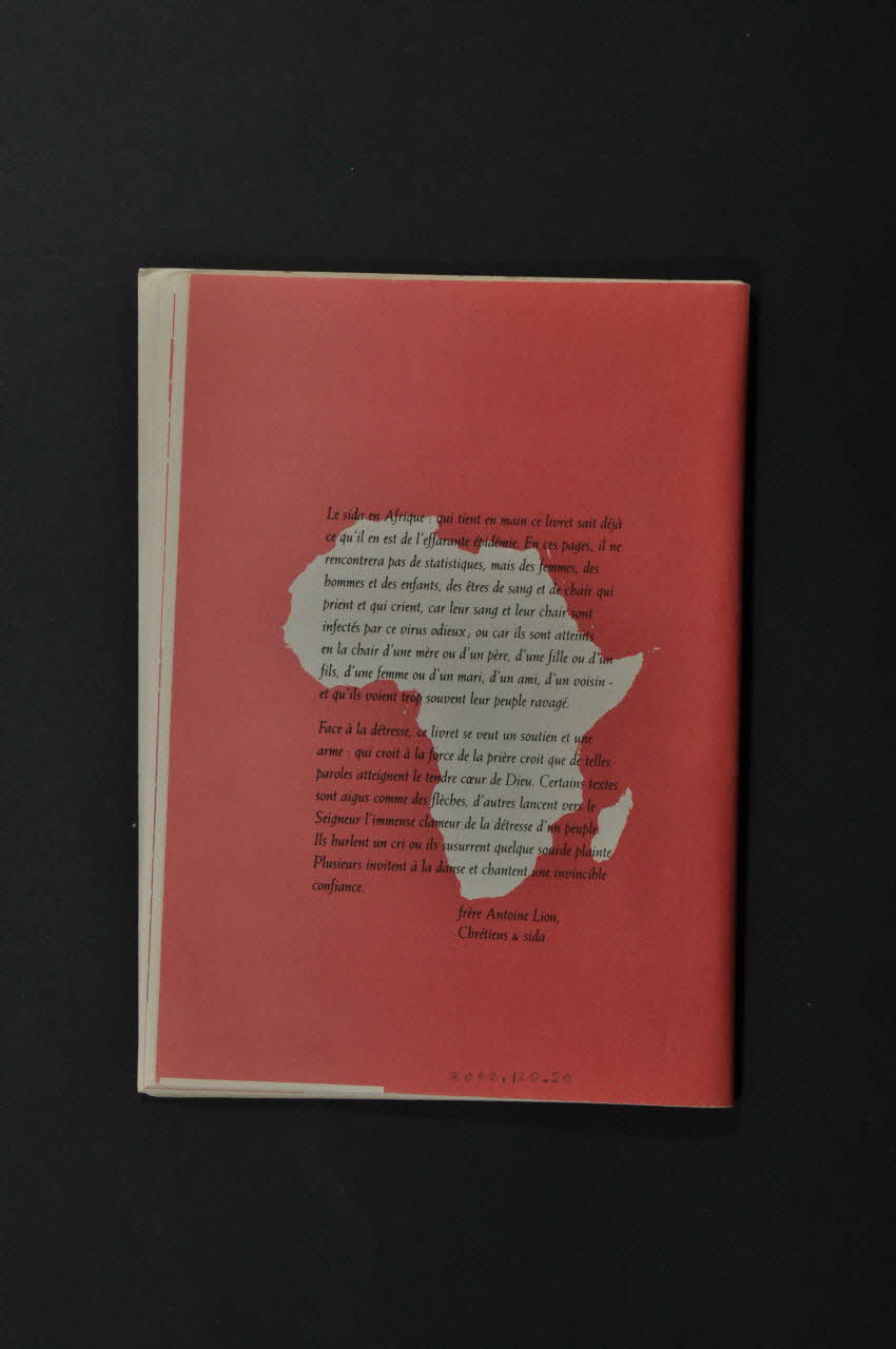 La couverture se compose d'une photographie noir et blanc pleine page : gros plans sur les mains d'Africains se les lavant. Le titre est imprimé en blanc en partie inférieure. L'arrière est rouge avec au centre une carte blanche de l'Afrique et un texte noir. L'intérieur constitue un recueil de textes, prières, psaumes, témoignages, etc, en noir et rouge sur fond incolore.Inscriptions