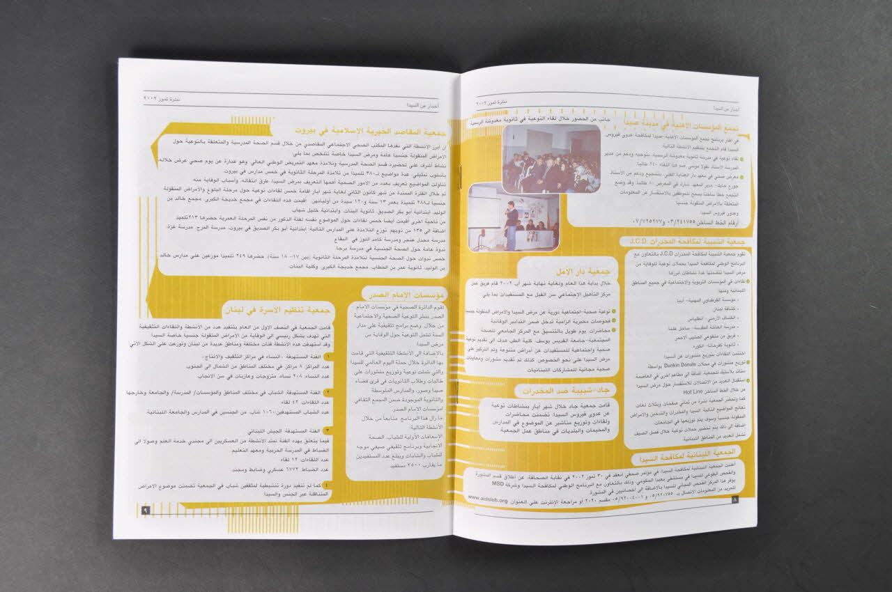 Le fond est blanc. Au recto, en haut, en caractères arabes, en rouge, figure le titre de la revue. A droite, se situe le logo du Programme National de Lutte contre le Sida au Liban. En dessous, commence le texte de la revue. A droite, à cheval sur le dos de couverture, figure un dessin d'une coupe avec un ballon doré et à côté, un petit ruban rouge avec en anglais, un texte en rouge. A l'intérieur, le fond est blanc avec des encadrés jaunes, verts bleus et des textes en noir, dans l'alphabet arabe. De nombreuses photos en couleur, représentant des groupes de personnes, accompagnent les textes.Inscriptions