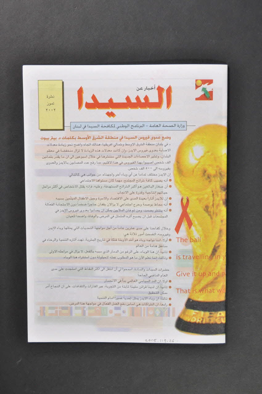 Bulletin d'information 2002 / FIFA Coupe du monde 2002 / Nombreuses photos couleur de réunions de l'association. / Articles en arabe (traduire les titres). - p.12 : Calendrier des conférences internationales - p.13 Données épidémiologiques et carte du monde - p.14 (en anglais) :Traduction d'un article américain sur la Gonococcie et la Chlamydia Dernière page : en anglais et espagnol : "I play for love united" (Je joue pour "Love United") . A côté, en noir : "FIFA World Cup 2002" . En dessous, à droite, en caractères noirs puis rouges : "Support the fight against AIDS" (Soutenez le combat contre le sida). En dessous, à droite, reproduction de la couverture de la cassette :"Love United. / Live for love united" Et, en bleu, en anglais :"Achetez cet album et aidez à soutenir le combat contre le sida au Liban".