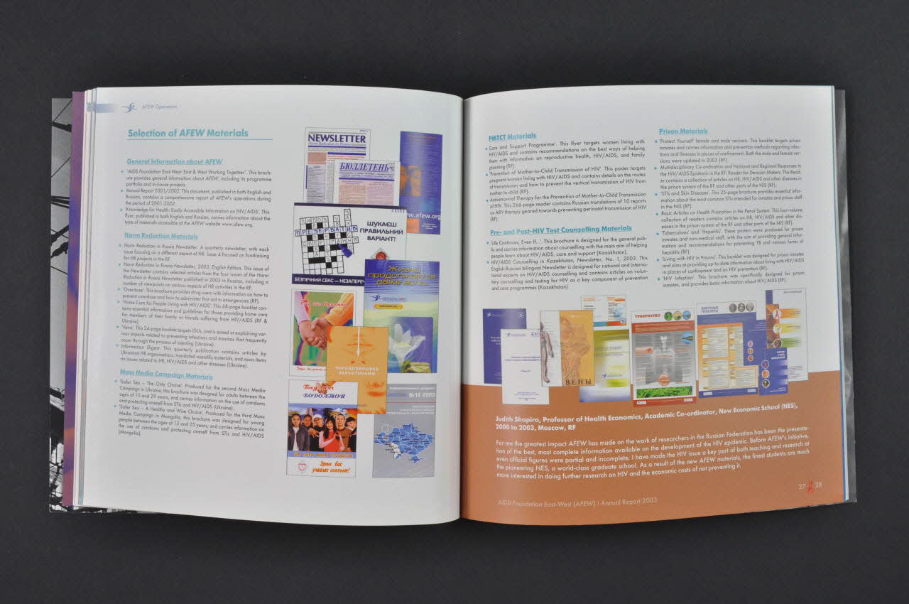 Version en anglais du rapport en russe 2004.239.4 1 La situation épidémiologique (carte, graphiques et commentaires) 2. Description et évaluation des programmes de l'association en 2003 : - Campagne auprès des medias sur le safer sex et la solidarité auprès des personnes atteintes.(ciblée jeunes / Ukraine et Mongolie) - Réduction des risques chez les usagers de drogues (Ukraine et Moldavie) : information, distribution de seringues et de préservatifs - Prévention du VIH et promotion de la santé dans les prisons (Moscou, Sibérie et Asie) : information, distribution de préservatifs, de désinfectants et de kits de premier secours - Counselling pre et post dépistage (Kazakhstan) - Soin et support aux personnes vivant avec le VIH/Sida (transmission mère enfant, groupes d'autosupport, accès aux traitements) - Promotion de la santé chez les travailleurs du sexe (Tajikistan et Uzbekistan) 3 Les autres activités de l'association : - "Advocacy" et engagement est-ouest - Département de l'information - Epidémiologie - Département publication : présentation des publications (certaines sont entrées dans la collecte) 4 Organisation de l'association (avec photos) 5. Partenariats par régions 6. Réseau international (rien de France, beaucoup de Pays-Bas et USA) 7. Activités du 1er décembre