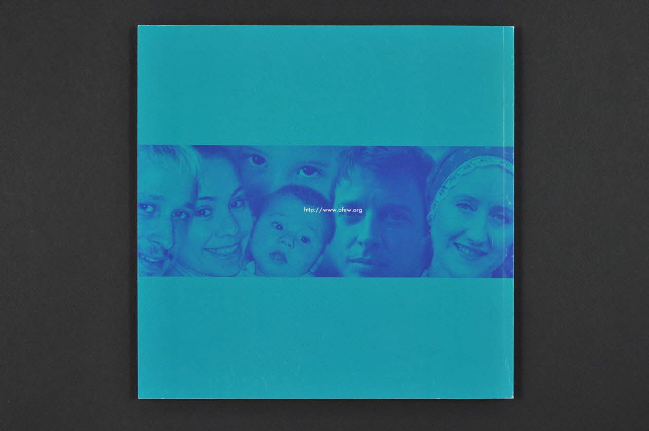 La couverture est bleu-vert avec un bandeau horizontal central de photographies : à gauche en couleur, deux mains jointes, puis en tons de bleu trois portraits. Le titre est inscrit en blanc sur le haut des premiers portraits. L'arrière comporte également un bandeau central de portraits photographiques bleus. L'intérieur contient des textes sur fonds blancs et colorés, illustrés de diverses photographies noir et blanc et couleur.Inscriptions