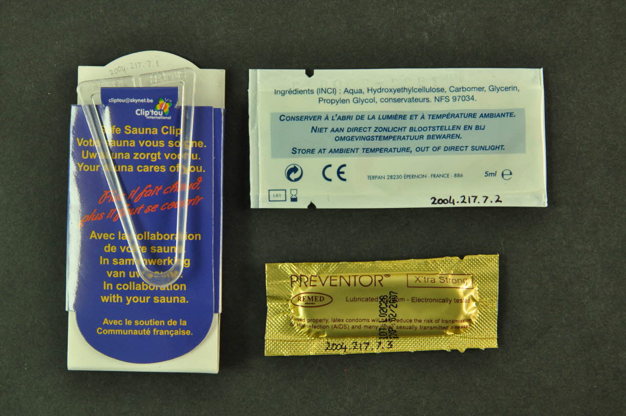 Lubrifiant à base d'eau pour préservatifs. (Sur la pochette du lubrifiant)Safe Sauna Clip. / Votre sauna vous soigne / Plus il fait chaud plus il faut se couvrir / Avec la collaboration de votre sauna (Sur le verso de la pochette), versoMarque