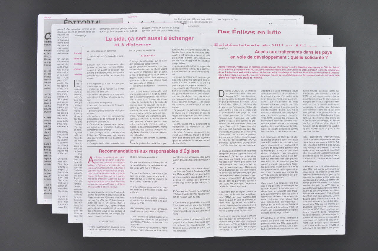 édito // Paul Giscard // // ouverture // Le fusil, la machette et le baton de berger // Joseph Sambiéni // // témoignage // Le sida, ça sert aussi à échanger et à dialoguer // // mosaîque // Accès aux traitements: quelle solidarité? // Akima Himmich // // convictions // Des Eglises en lutte // Pasteur Trimua (En première page)Date