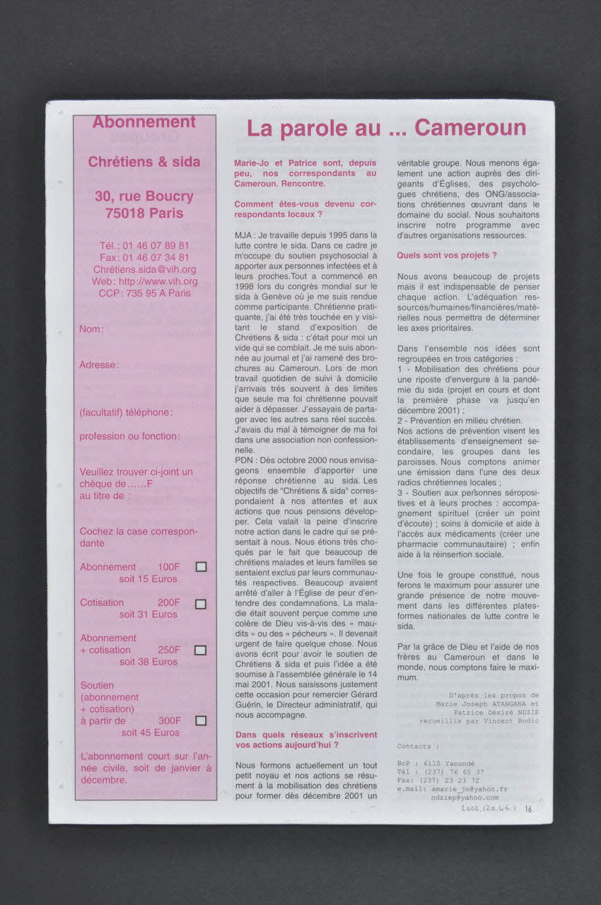 Chrétiens & sida // // Directeur de publication: // Jacques Gradt // // Comité de rédaction: // Comité pour l'Afrique // // Réalisation: Vincent Bodic // // [...] // // Imprimerie SIEP - 77590 Bois le Roi // ISSN 1267-8457 (En bas de la page 15, dans un cadre rose.), à l'intérieurTitre