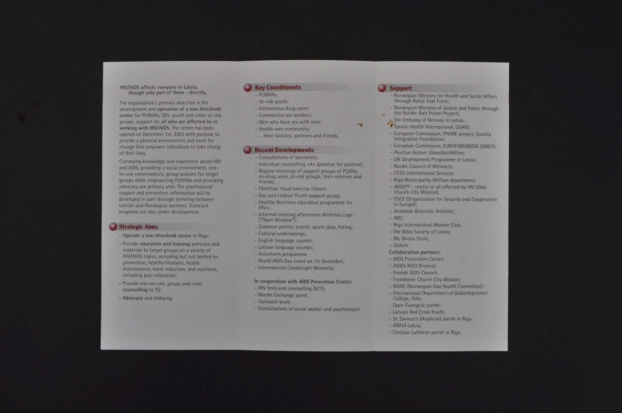 Précisions sur le contenu : - Publics visés : personnes vivant avec le VIH et le sida / jeunesse à risque / injecteurs de drogues / travailleurs du sexe / hommes ayant des rapports sexuels avec des hommes / soignants / leurs familles, partenaires et amis - Activités : consultations de spécialistes / counseling individuel / groupes de support spécialisés / rituels tibétains / groupe de support de jeunes gays et lesbiennes / programme d'éducation nutritionnelle pour les personnes séropositives / Après midis de rencontre informelle / parties communes, sport... / évènements culturels / cours d'anglais / cours de lituanien / programme pour les volontaires / évènements du 1er décembre / international candellight memorial - En collaboration avec le AIDS Prevention Centre : tests de dépistage du VIH et counselling / point d'échange de seringues / travail de terrain / consultation d'un assistant social et d'un psychologue.