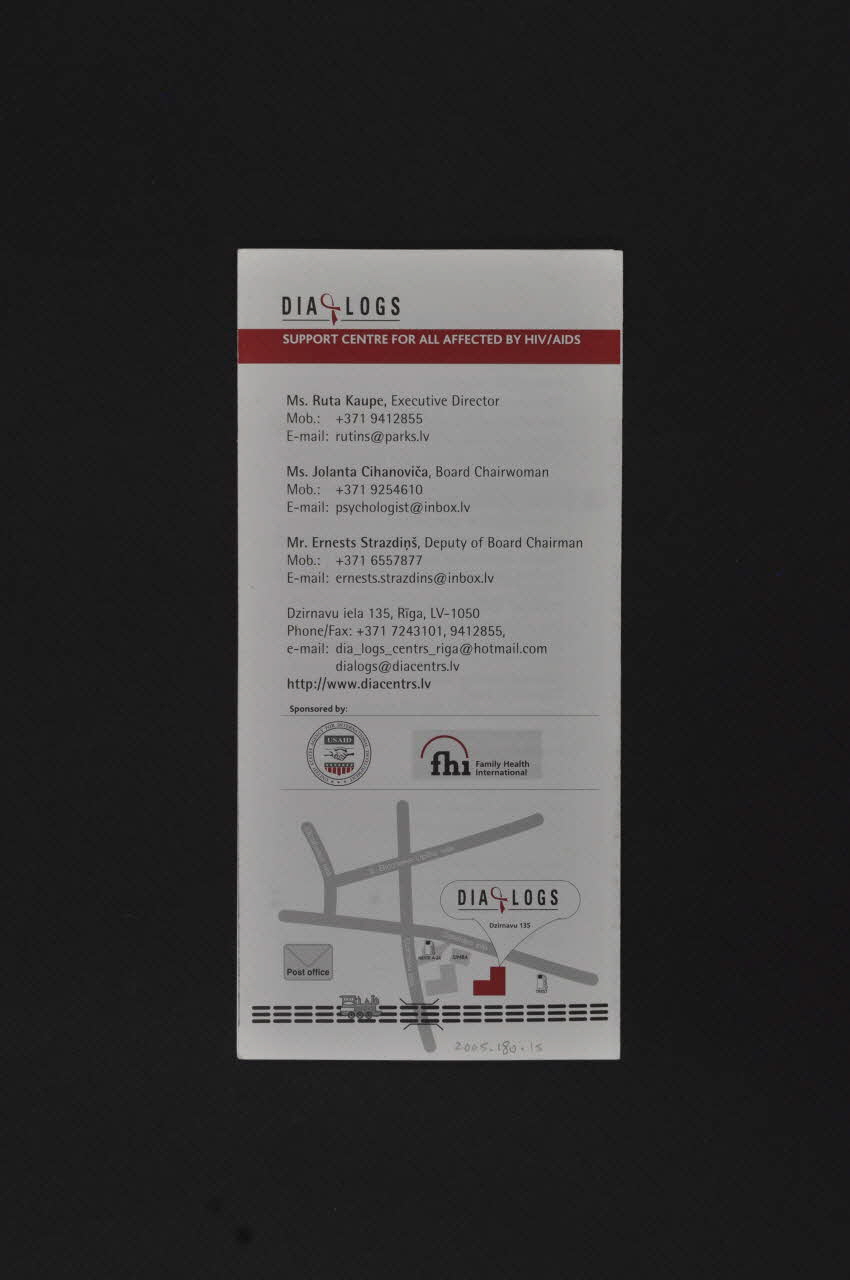 DIA LOGS // SUPPORT CENTRE FOR ALL AFFECTED BY HIV/AIDS (Imprimé en noir verticalement sur blanc), rectoAdresse