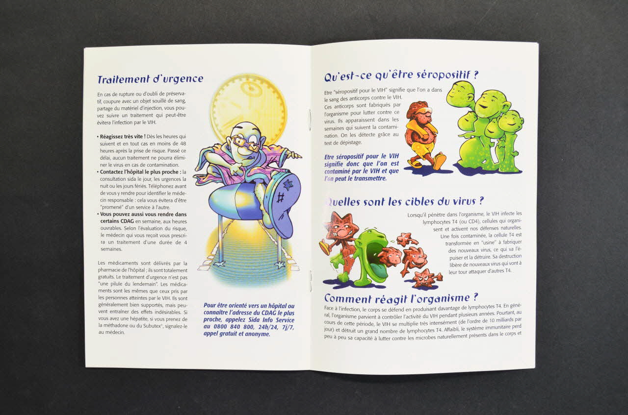- Modes de transmission du VIH // - Le préservatif masculin // - Le préservatif féminin // - Traitement d'urgence // - Qu'est-ce qu'être séropositif ? // - Quelles sont les cibles du virus ? // - Comment réagit l'organisme ? // - Comment est surveillée l'évolution de la maladie ? // - Fluctuations // - Pourquoi prendre des traitements anti VIH ? // - Prendre ses traitements régulièrement // - (Bien) vivre avec son traitement // - Maintenir l'efficacité du traitement // - Face aux difficultés, faites-vous aider ! (titres en italique en gros caractères), à l'intérieurLogo