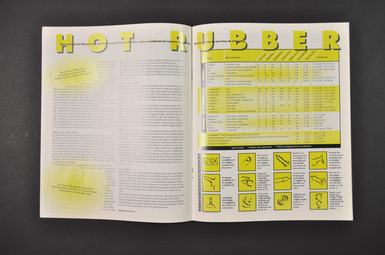 Sommaire (traduire les titres) - p.2 Editorial : Maximaal twee gram. - p.4 GC & GD : gele en rode kaarten - p.5 Eén dag gedeoogbus (le bus de réduction des risques avec photos des usagers) - p.6 Aidsbedden bij het Leger (bain à bulle dans un hébergement pour malades du sida ???) - p.7 Actie. "Heroïne Vrij !!"(surligné de noir dans le sommaire) - p.8 Portrert Kunstenaar in keramiek (portrait d'un céramiste) - p.11 Sexwerk. "Uiteindelijk zijn het allemaal klootzakken" (surligné de noir dans le sommaire) (travail du sexe) - p.12 Omstreden Surinaams aidsmedicijn (surligné de noir dans le sommaire) (Traitement du sida au Surinam) - p.14 In memoriam Flip Fermin (illustré style BD) - p.15 Zout zuivert, ammonia bijt (signalé et photo en couverture) - p.16 Condoom-overzicht. Double page sur les préservatifs Hot Rubber, comparatif avec les autres marques de préservatifs, mode d'emploi. - p.18 Dope-historie (surligné de noir dans le sommaire) - p.20 Seropositief en zwanger (surligné de noir dans le sommaire), (signalé en couverture) (grossesse) - p.23 EHBO. (Eigen Hulp Bij Ongerief) De stoelgang (Conseils contre les diarrhées ??) - p.24 The Blues Cheb Khaled (surligné de noir dans le sommaire), (signalé en couverture) (Le roi du raï) - p.26 Aidsnieuws (immunothérapie passive / lavage de sperme / gilms sur le sida) - p.27 Scene Fazantenhof - p.28 Dagboek Brigitte De schreeuw van binnen (surligné de noir dans le sommaire) (Journal) - p.30 Schema spuitenruil Amsterdam (Calendrier associatif) - p.30 Puzzel (Mots croisés) - p.31 Trips. Zomer in het Vondelpark - p.32 Snapshots (vignettes photograhiques noir et blanc : lieux d'Amsterdam) - Extra Hot Rubber Easy (surligné de noir dans le sommaire), (signalé en couverture) Double page sur les préservatifs Hot Rubber, comparatif avec les autres marques de préservatifs, mode d'emploi. cf p.16. Apparemment il y avait collé sur la page un préservatif Hot Rubber qui a disparu.