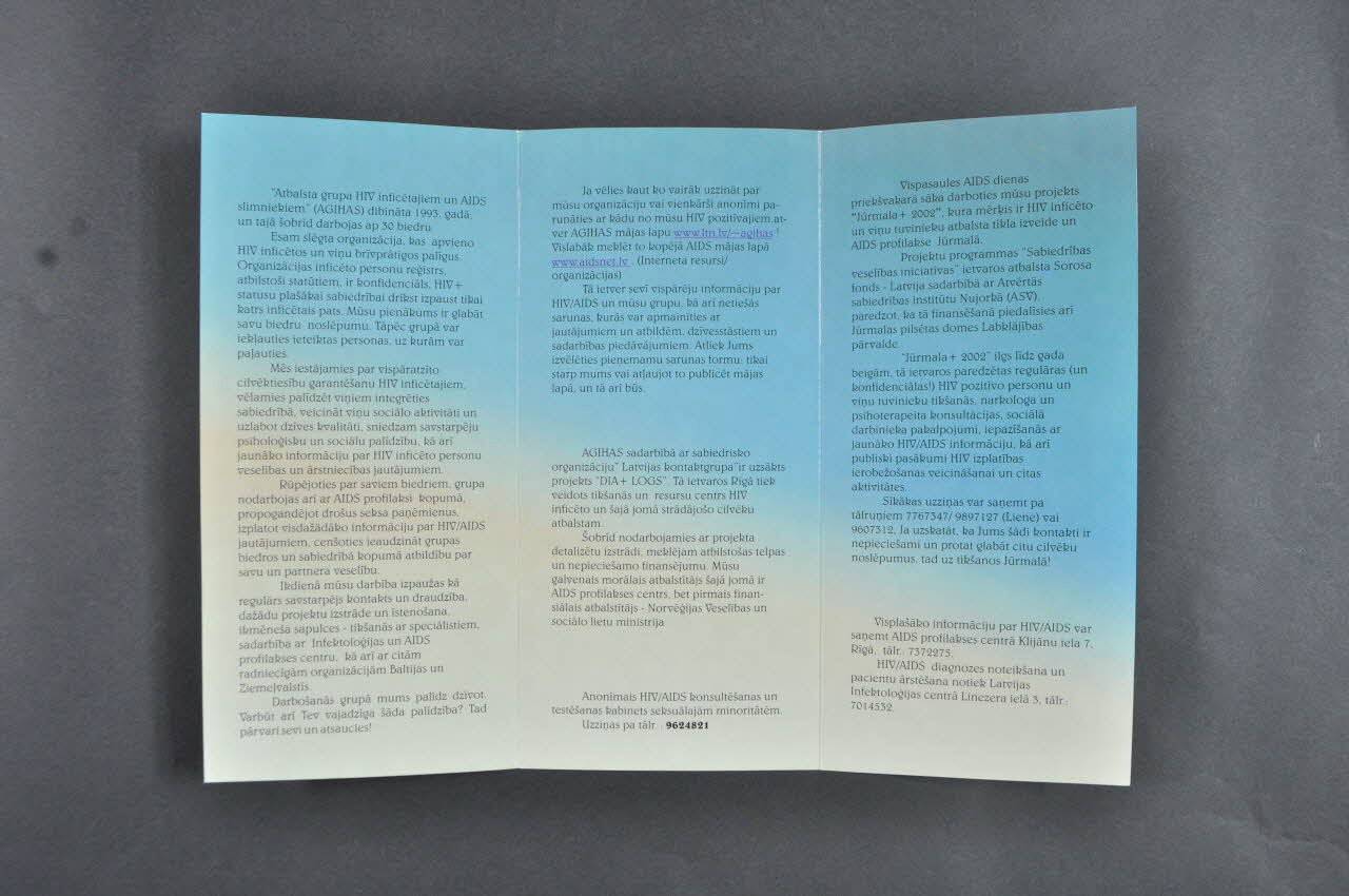 Atbalsta // Grupa // Inficetajiem ar // HIV un // AIDS // Slimniekiem" (Imprimé en rouge et noir dans le haut, sur fond bleu. La première lettre de chaque mot est imprimée en rouge.), rectoAdresse