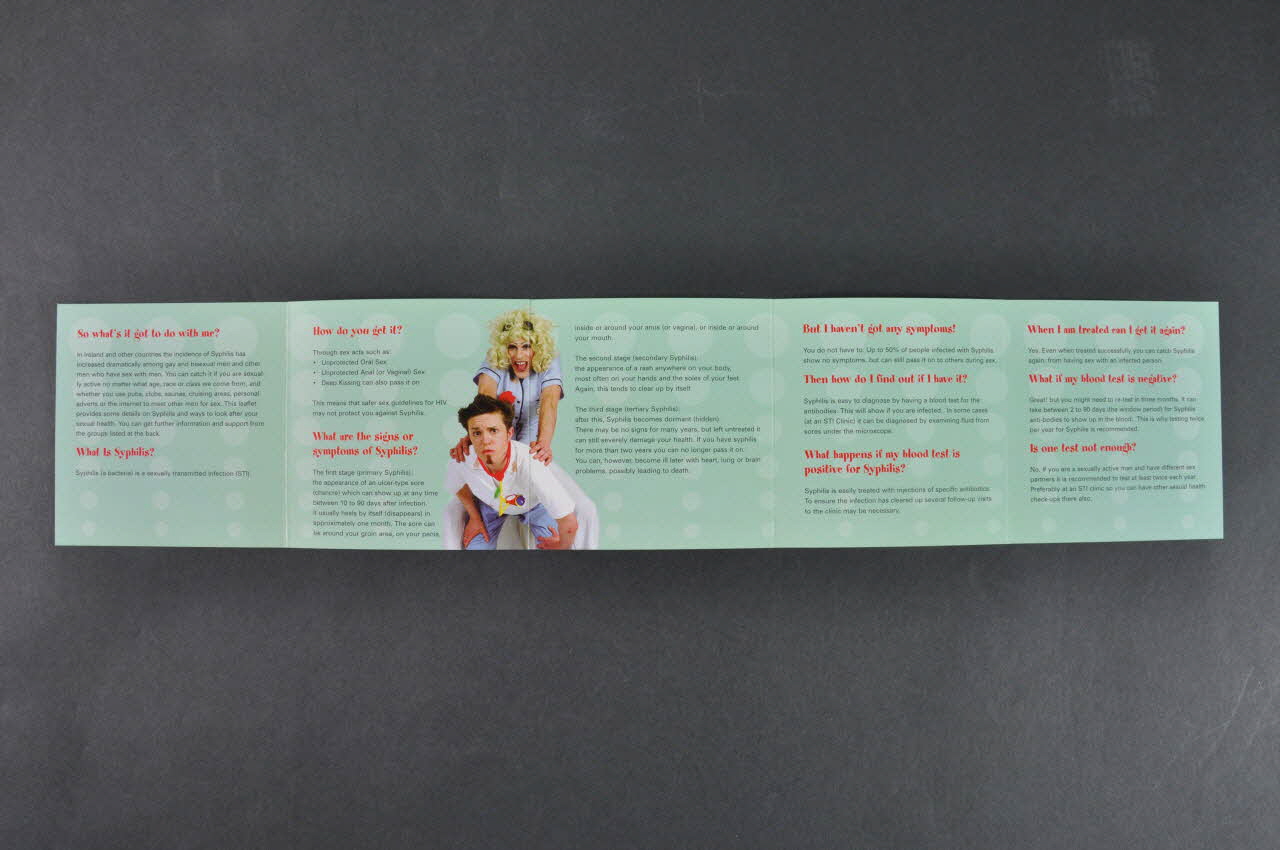 - So what's it got to do with me ? // - What is syphilis ? // - How do you get it ? // - What are the signs or symptoms of syphilis ? // - But I haven't got any symptoms! // - Then how do I find out if I have it ? // - What happens if my blood test is poisitive for syphilis ? // - When I am treated can I get it again ? // - What if my blood test is negative ? // - Is one test not enough ? // - What about syphilis an HIV ? // - How can I be sure I will not get syphillis ? // - I like having sex with different people so what can I do ? // - Where can I get tested ? (inscriptions en rouge au fil du texte), à l'intérieurTexte