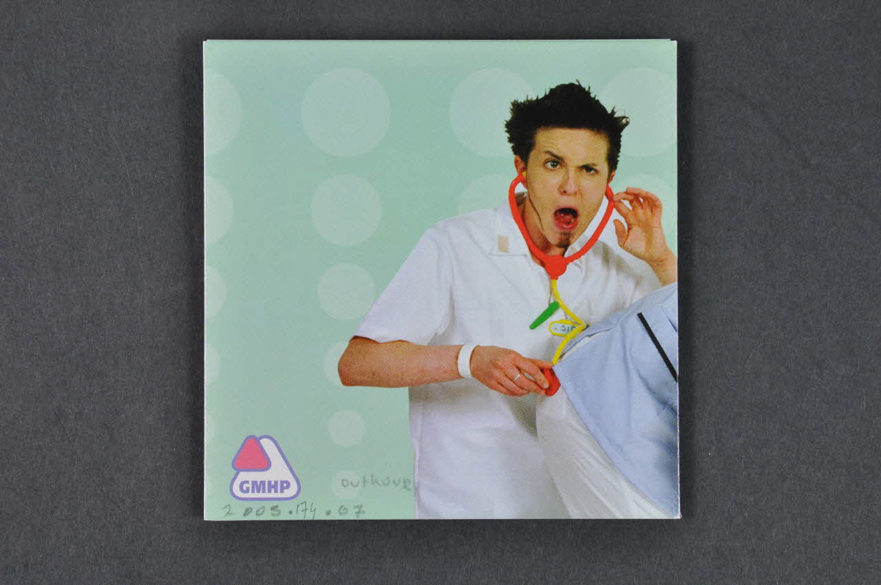 La couverture comporte un fond vert avec des ronds plus clairs. Une femme blonde habillée en soignante est représentée au centre, penchée, la bouche ouverte. Des inscriptions en rouge et en noir figurent dans le coin supérieur gauche et dans le coin inférieur droit. Le dos du dépliant comporte le début de l'image de la couverture : un jeune homme en blouse blanche avec un stéthoscope qu'il appuie sur le dos de la jeune femme de la couverture. Cette image s'inscrit sur le même fond vert. Un logo triangulaire est présent dans le coin inférieur gauche. L'intérieur du dépliant comporte un texte en noir sur fond vert avec les titres en rouge. Au centre (sur les feuillets 2 et 3), on retrouve les deux soignants qui étaient représentés sur la couverture et le dos. La femme est cette fois-ci à cheval sur le dos de l'homme.Inscriptions