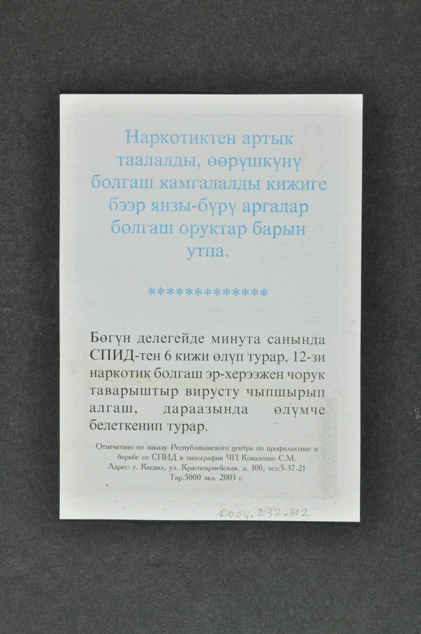 On peut voir dans la partie supérieure un dessin d'un skieur en tenue rouge et jaune dévalant lesv pistes sur un fond de ciel bleu. Il y a le ruban rouge en haut à gauche et des inscriptions en rouge et en jaune. Un bandeau bleu avec des inscriptions jaunes en cyrillique sépare le flyer en deux, et l'on peut voir dessous un dessin représentant des drogues près d'un cimetierre. Au dos il y a un texte en bleu et un texte en noir sur fond blanc. Les coordonnées de l'association sont en bas. Le document est entièrement rédigé en alphabet cyrillique.Décor