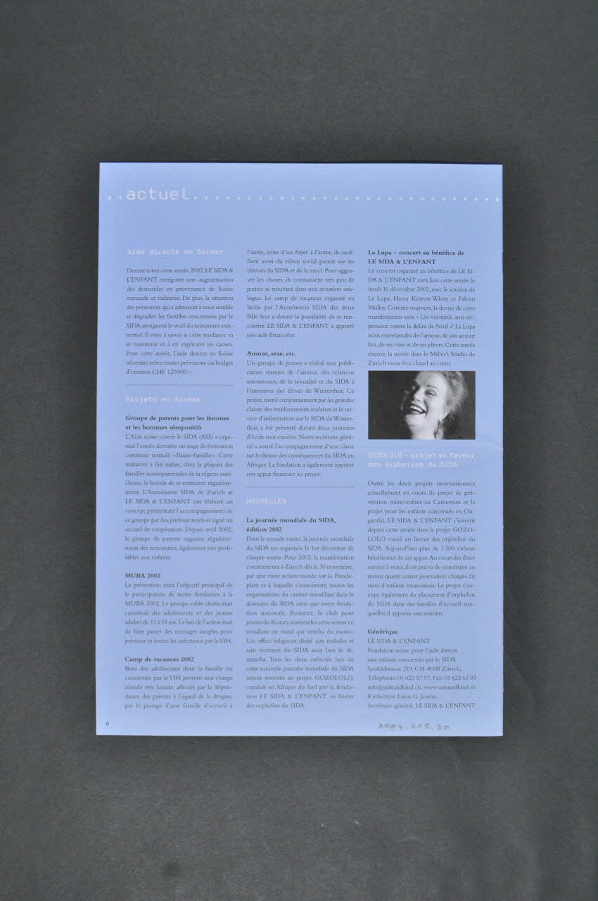 Bulletin Le sida et l'enfant Infoletter 2.02 // Quand un virus affecte toute l'existence // Congrès européen des jeunes concernés par le VIH/Sida // Le sida & l'enfant // Seefeldstrasse 219, 8008 Zurich. Telephobe 01 422 57 57, // Fax 01 422 62 92 // info@aidsundkind.ch // www.aidsundkind.chTitre, sommaire