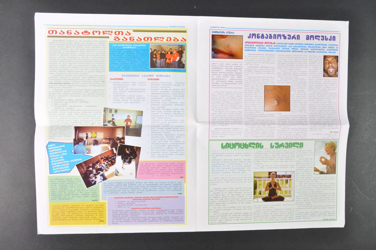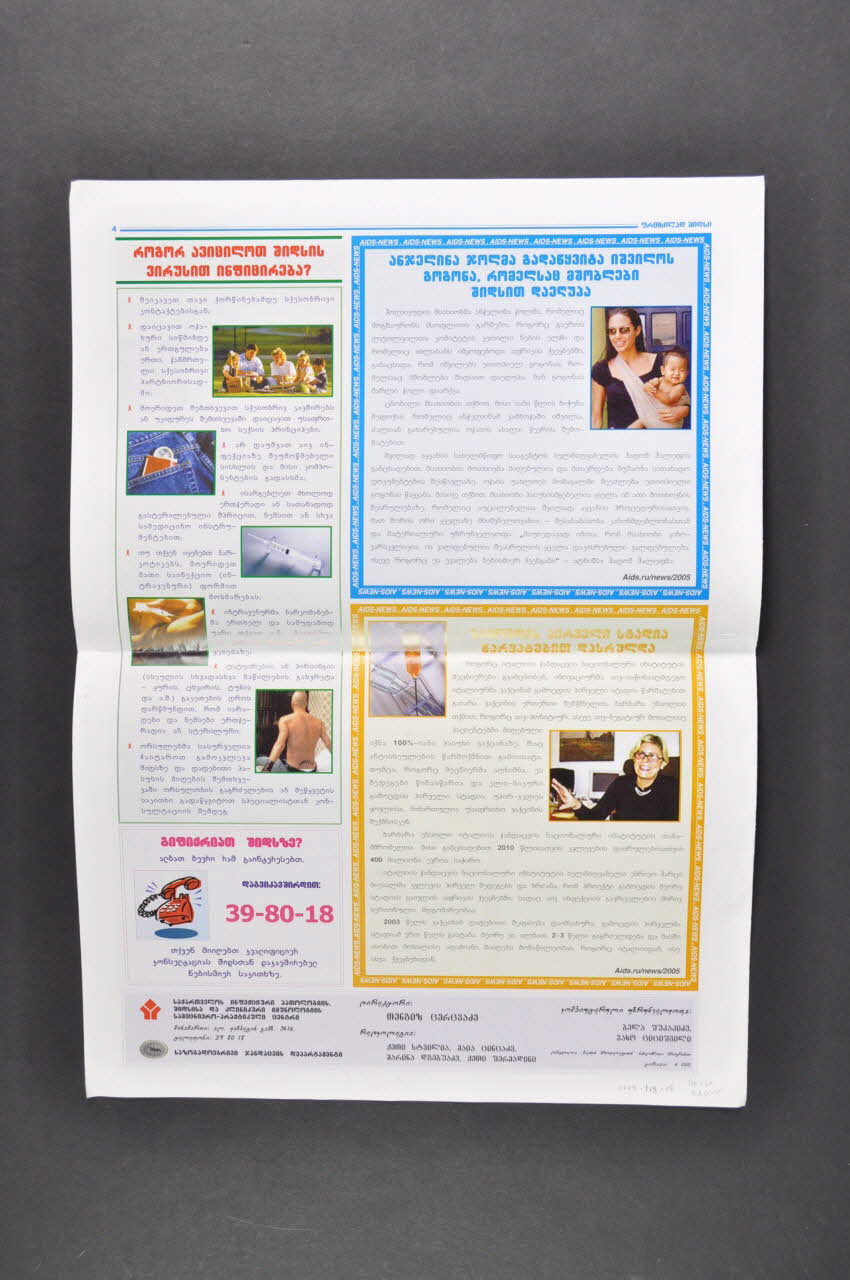 Elle est de forme rectangulaire et se lit dans le sens vertical. Au recto, sur un bandeau, bleu clair, figure le titre en lettres arc-en*ciel. Dessous, en petits caractères bleus, une inscription en géorgien et anglais. En dessous, se trouve un encart jaune et en dessous un encart vert à gauche et un encart rose à droite. Chaque encart est successivement illustré d'une carte et d'un graphique; d'une de main; de deux portraits. La page 2, le fonds est vert, bleu, gris, rose, vert, jaune, violet La page 3, en haut, fond gris avec un texte et trois photos en couleurs de visages avec des boutons. En bas le fond est vert, avec un texte et deux photos de femmes en position de yoga. La page 4, contient trois encarts gris, bleu, jaune avec vignettes. Les photos représentent : un préservatif, unr seringue, un tatouage, une mère et son enfant et une seringue.Inscriptions