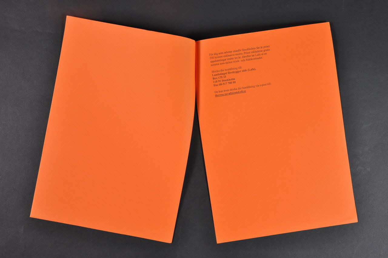 C'est un prospectus en suédois constitué de deux feuilles de papier machine de couleur orange agrafées dans l'angle supérieur gauche.