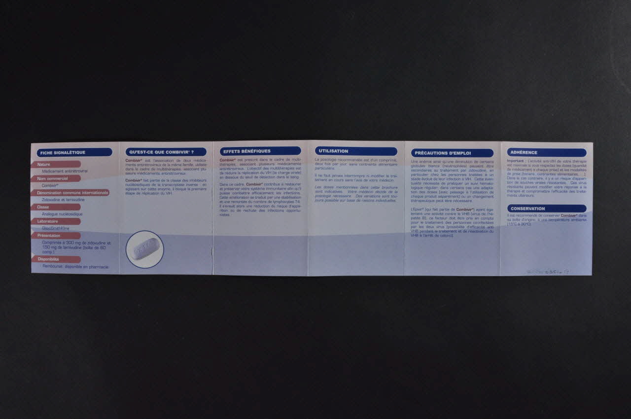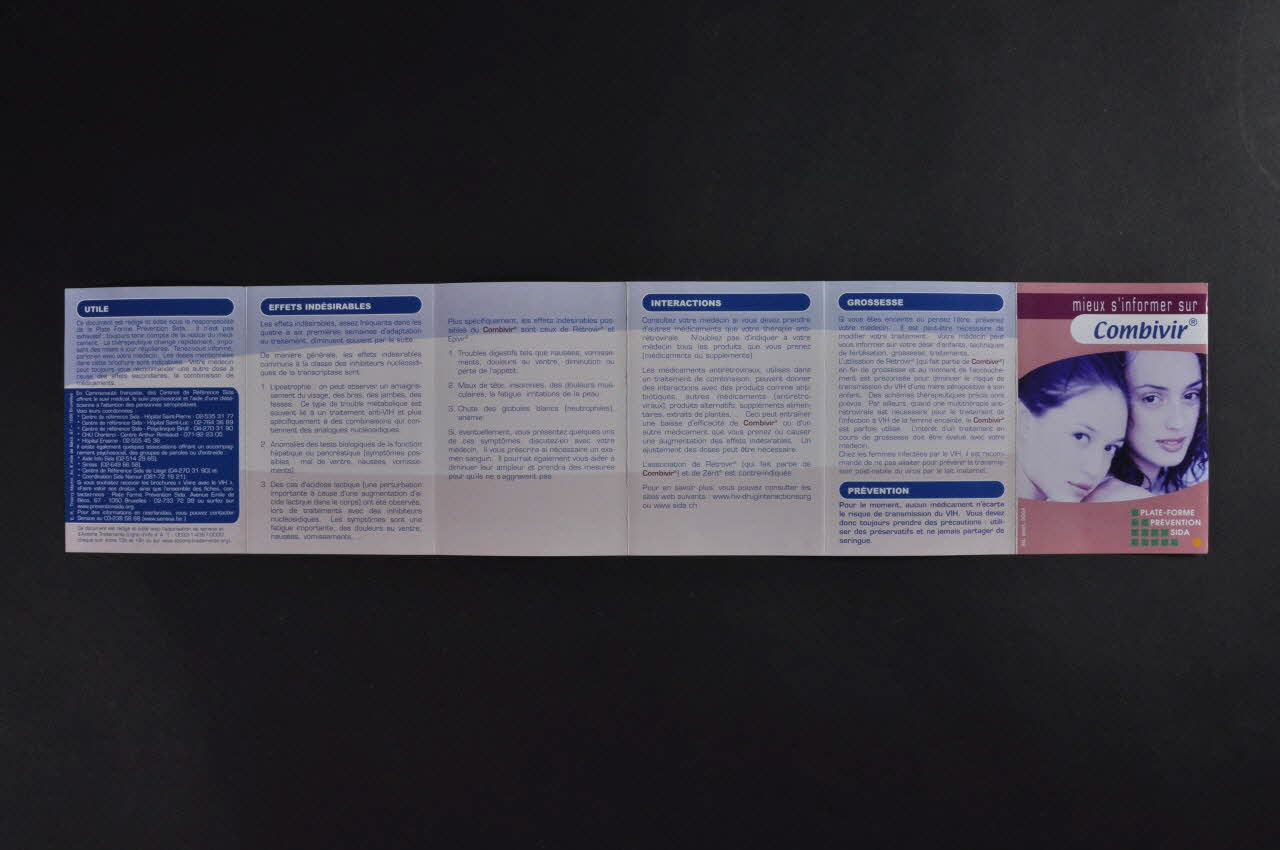 Mieux s'informer sur Combivir (Titre du dépliant imprimé sur la couverture.)Fiche signalétique // Qu'est-ce que Combivir ? // Effets bénéfiques // Utilisation // Précautions d'emploi // Adhérence // Conservation // Effets indésirables // Interactions médicamenteuses // Grossesse // Prévention // Utile (Titres des rubriques présentes dans le dépliant.)PLATE-FORME / PREVENTION / SIDA (Nom de l'association imprimé en bas à droite de la couverture.)Décor