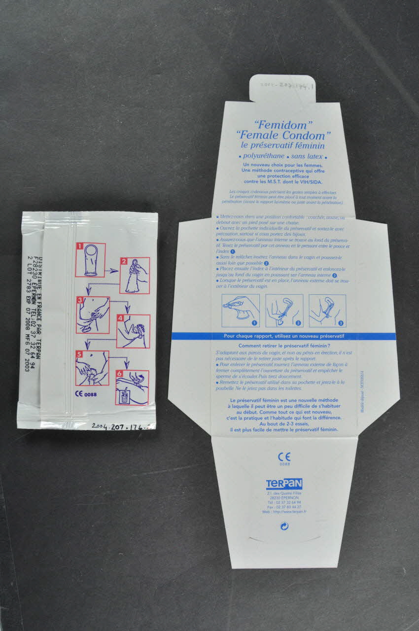 Devant, en italiques et tout en bas, en capitales se trouvent des inscriptions. Tout en bas, on trouve les logos de l'INPES, du Ministère de la Santé, de Sida Info Service. Au dos, sur fond rose, se trouvent des inscriptions. L'intérieur présente des inscriptions sur fond blanc en bleu. Le volet du bas présente les normes CE et coordonnées de Terpan. Dans enveloppe blanche est conservé un préservatif féminin. Au dos on trouve six schémas d'utilisation non légendés.Inscriptions