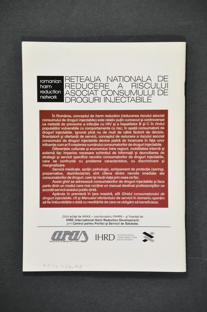 aras // ASOCIATIA ROMANA ANTI-SIDA // // IHRD // INTERNATIONAL // HARM REDUCTION // DEVELOPMENT (Imprimé en noir sur blanc dans la partie inférieure, deux logos), versoDate