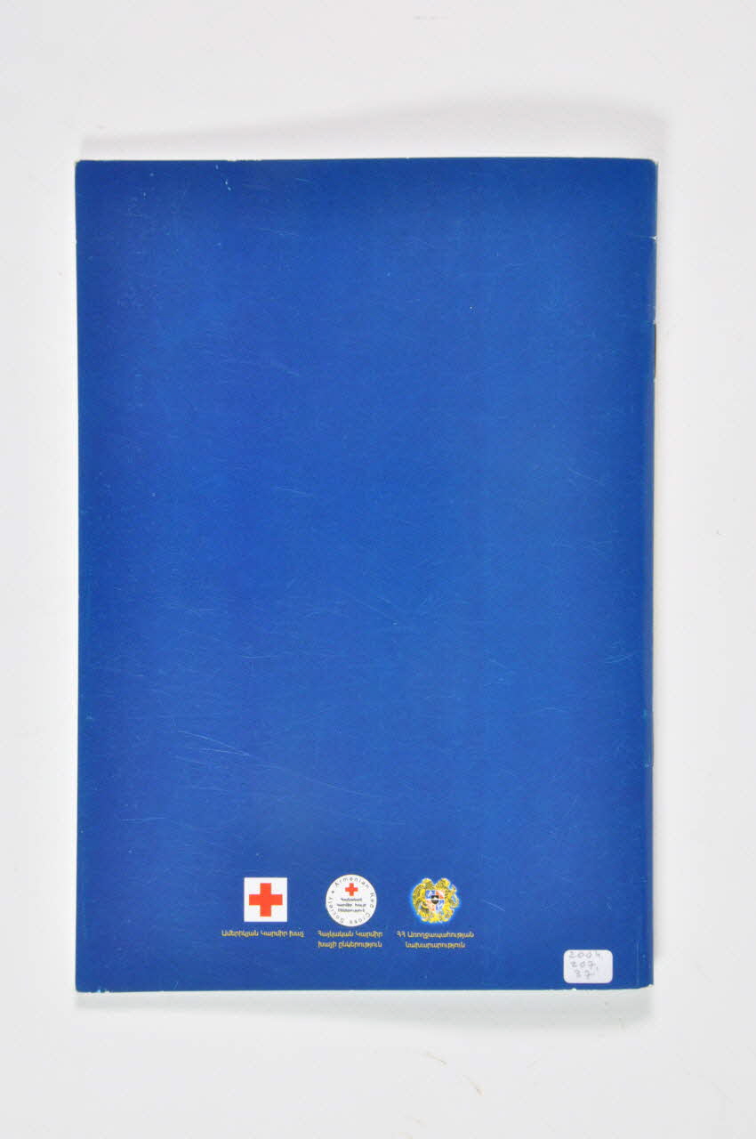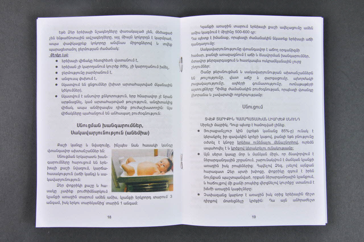 La couverture comporte un fond divisé en quatre rectangles (jaune, orange, vert, jaune) sur lequel se détachent la silhouette d'une femme bleue portant un enfant orange sur ses genoux et la silhouette d'une femme bleue et orange tenant un enfant orange par la main.. En haut, figure un bandeau bleu contenant une inscription en arménien et le logo de l'association. Le dos de la brochure comporte un fond bleu. Trois logos alignés se trouvent dans la partie inférieure. L'intérieur de la brochure contient un texte en noir sur fond blanc. Le texte est accompagné de photographies couleur d'enfants sur certaines pages.Décor